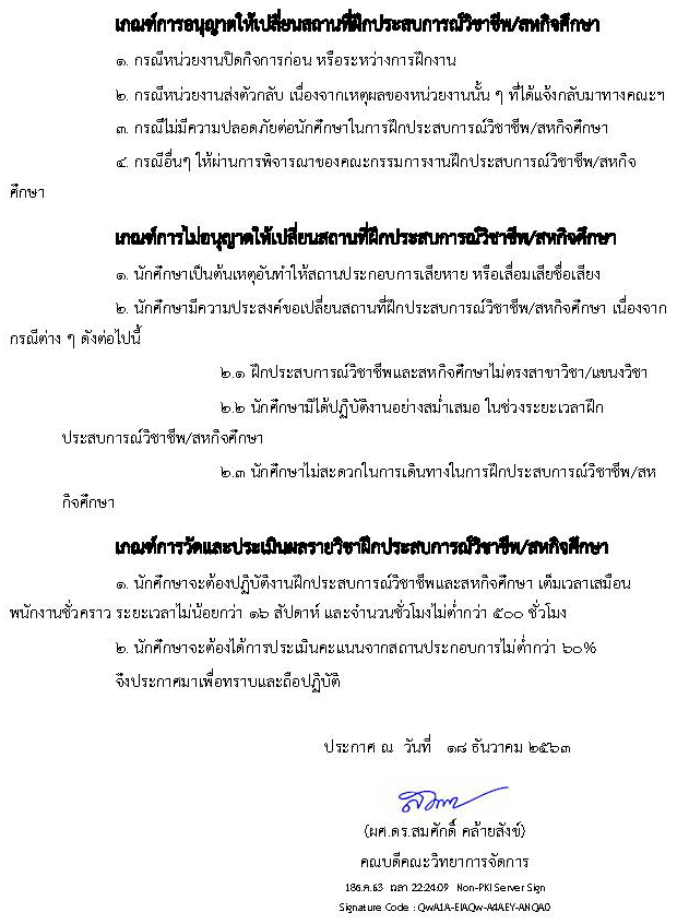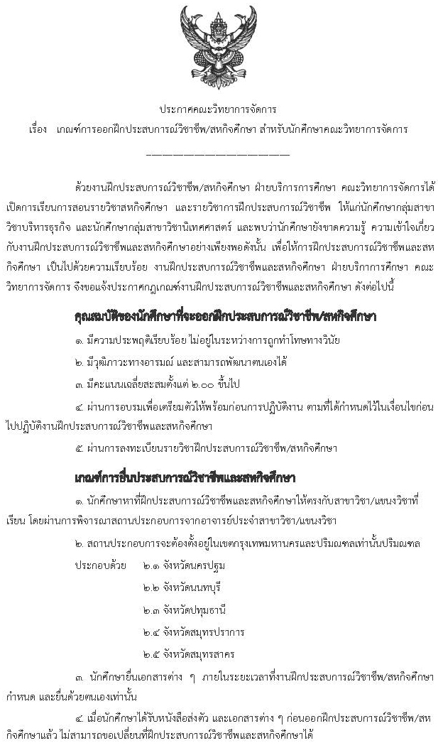 > เกณฑ์การออกฝึกประสบการณ์วิชาชีพ/สหกิจศึกษา สำหรับนักศึกษาคณะวิทยาการจัดการ
