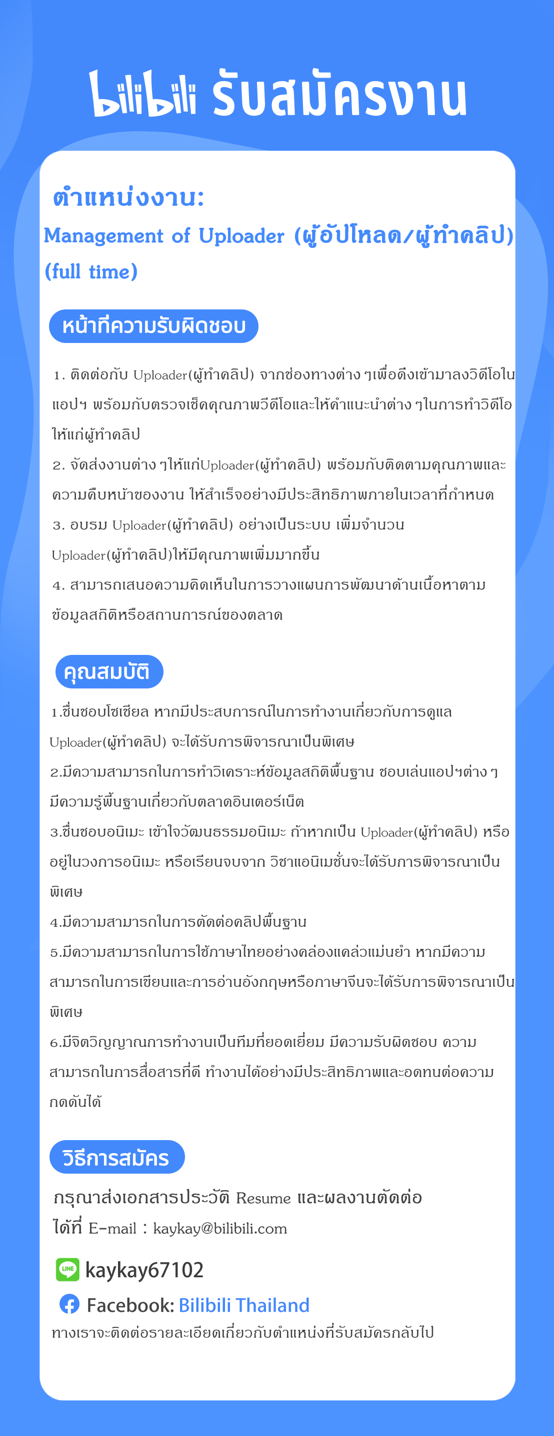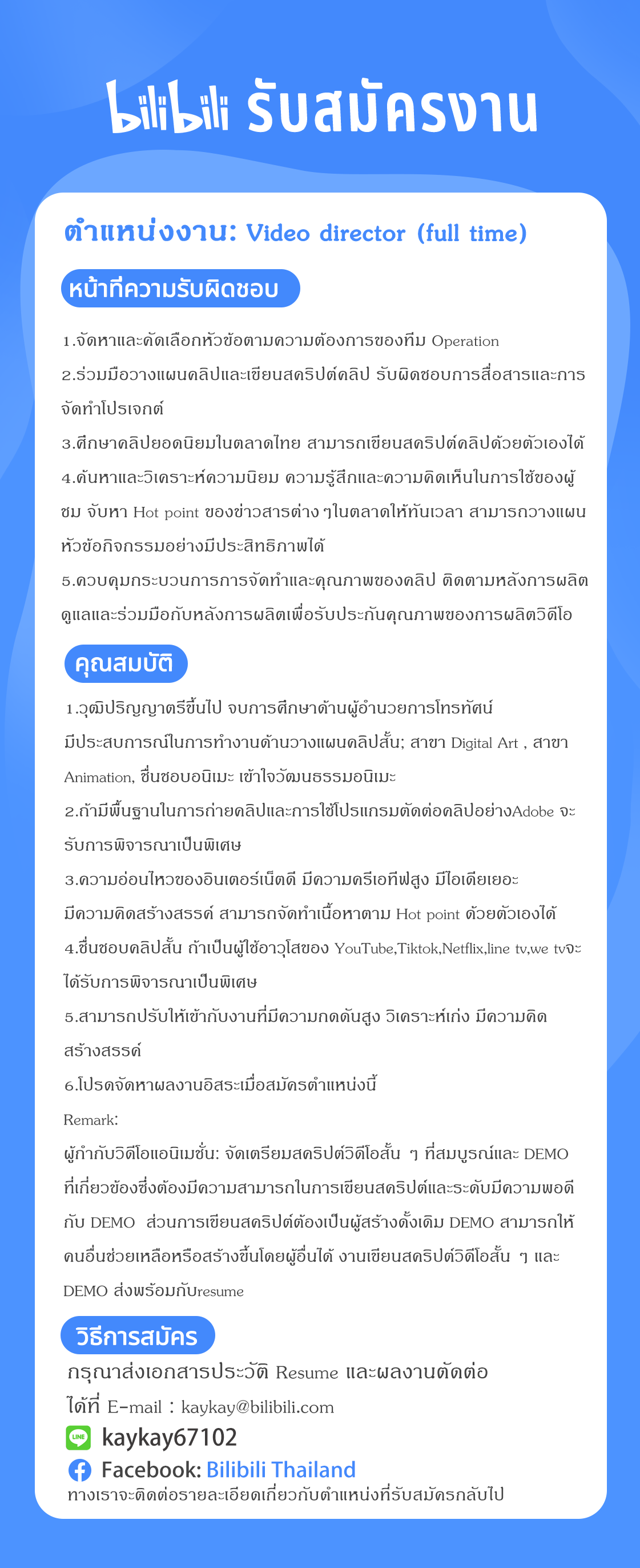 บริษัท bilibili thailand เปิดรับสมัครตำแหน่งเกี่ยวกับแอนิเมชั่นเช่น video director(full time)/ uploader management(full time) / video editer(part time) ยินดีรับนิสิตนักศึกษาที่จบใหม่