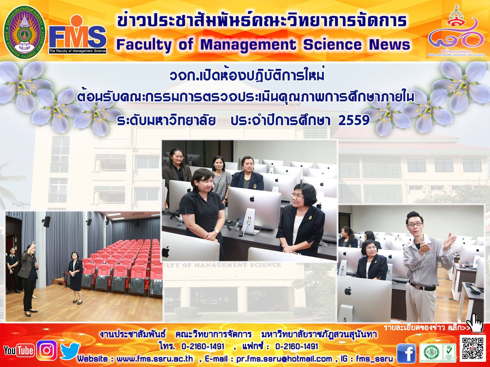 วันที่ 3 ตุลาคม 2560 ผู้ช่วยศาสตราจารย์ ดร.ชารวี บุตรบำรุง รองคณบดีฝ่ายแผนงานและประกันคุณภาพ คณะวิทยาการจัดการ พร้อมด้วยบุคลากรประจำคณะฯ ให้การต้อนรับคณะกรรมการตรวจประเมินคุณภาพการศึกษาภายใน ระดับมหาวิทยาลัย ประจำปีการศึกษา 2559 นำโดย ผู้ช่วยศาสตราจารย์ ดร.ตวงรักษ์ นันทวิสารกุล กรรมการตรวจประเมินคุณภาพการศึกษาภายใน จากสำนักงานคณะกรรมการการอุดมศึกษา (สกอ.) ให้เกียรติเข้าเยี่ยมชมห้องปฏิบัติการ Mini Theater และห้องปฏิบัติการคอมพิวเตอร์กราฟฟิก Imac Osx เพื่อเยี่ยมชมห้องปฏิบัติการจัดการเรียนการสอน แลกเปลี่ยนเรียนรู้และให้ข้อเสนอแนะที่ดีในการดำเนินงานของคณะฯ ให้ก้าวหน้าต่อไป พร้อมทั้งให้คำชมว่าคณะวิทยาการจัดการมีห้องปฏิบัติการที่ทันสมัย เป็นแหล่งการศึกษาเรียนรู้และการฝึกปฏิบัติการด้านการเรียนการสอนที่ครบวงจร