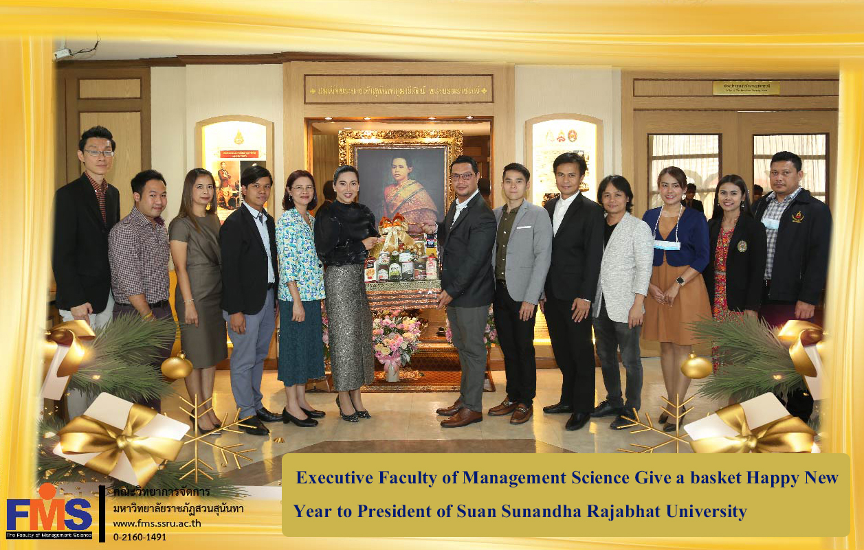 On December 23, 2020, the Faculty of Management Science is led by Assistant Professor Dr. Somsak Klaysung, Dean and Executive Committee, Deputy Dean, Lecturer, Head of the Dean's Office Academic Support Personnel Met and gave a New Year's gift basket to Associate Professor Dr. Chutikarn Sriviboon, President of Suan Sunandha Rajabhat University on the occasion of the new year and welcome the new year 2021 at the office of the president, 5th floor, Suan Sunandha Rajabhat University.