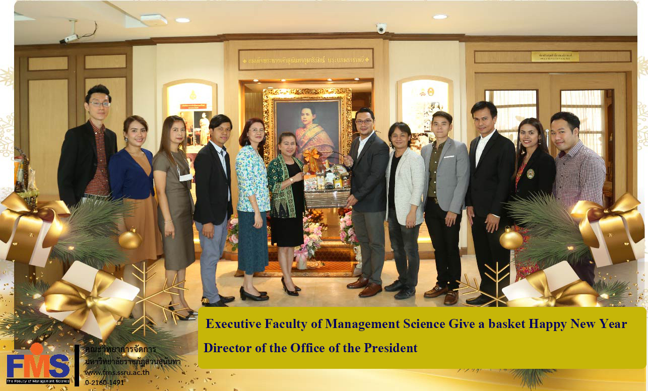 On December 23, 2020, Faculty of Management Science by Assistant Professor Dr. Somsak Klaysung, Dean and Executive Committee, Associate Dean, Lecturer, Head of the Dean's Office. Academic Support Personnel Give New Year gift baskets to Mrs. Chuneerat Channit, Director of the Office of the President On the occasion of New Year's Eve and New Year 2021 at the Office of the President, 5th Floor, Suan Sunandha Rajabhat University.