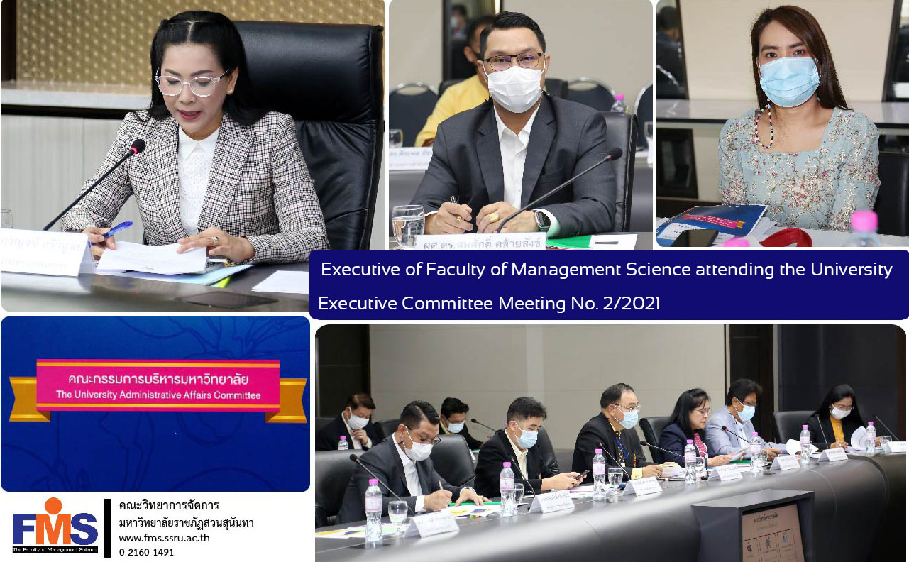 On February 8, 2021, at 9:30 a.m. Assistant Professor Dr. Somsak Klaysung, Dean of the Faculty of Management Science along with Ms. Jinjuta Srihera, Head of the Office of the Dean, Faculty of Management Science attended the University Executive Committee Meeting No. 2/2021 by Associate Professor Dr. Chutikarn Sriviboon, President of Suan Sunandha Rajabhat University Presided over the meeting at the meeting room of Suan Sunandha Rajabhat University, Building 31, 5th floor.