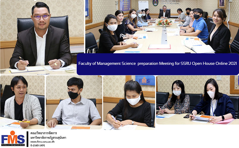On March 11, 2021 at 10.00 a.m. Faculty of Management Science, Suan Sunandha Rajabhat University arrange a preparatory meeting SSRU Open House Online 2021 was organized by Assistant Professor Dr. Somsak Klaysung, Dean of the Faculty of Management Science. Chair the meeting Together with Prof. Pitimanat Bunlue, Deputy Dean for Administration, Lecturer Dr. Krisana Chuerchainat, Deputy Dean for Academic Affairs To clarify the preparation guidelines for SSRU Open House Online 2021 activities to be held on March 31 - April 1, 2021, there was a committee for organizing the activities to attend the meeting, consisting of branch heads, branch heads, branch heads, office heads. dean Publicist And computer scholars Attending the meeting at the Ruamjai Management Conference Room 1, Faculty of Management Science.