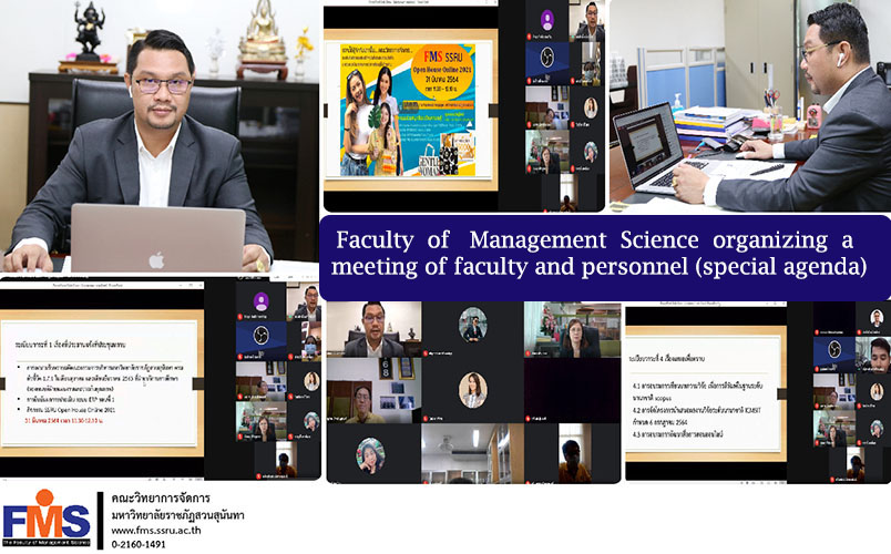 On March 29, 2021 at 1:30 p.m. Faculty of Management Science Organizing a meeting of faculty and personnel (special agenda), with Assistant Professor Dr. Somsak Klaysung, Dean, chairing the meeting. Together with the Deputy Dean of all divisions The agenda for the meeting on the signing of the Board of Directors of Suan Sunandha Rajabhat University according to the indicator of confirmation of the ERP system assessment, round 1, SSRU Open House Online 2021 activity will be held on Wednesday March 31, 2021. Research paper writing training For publication in an international base, Scopus organizes an international research presentation program, ICMSIT, online teaching development training. And nominating external experts To be appointed as a faculty committee (Instead of the vacant position) There are faculty members and academic support personnel in the faculty attend online meetings.