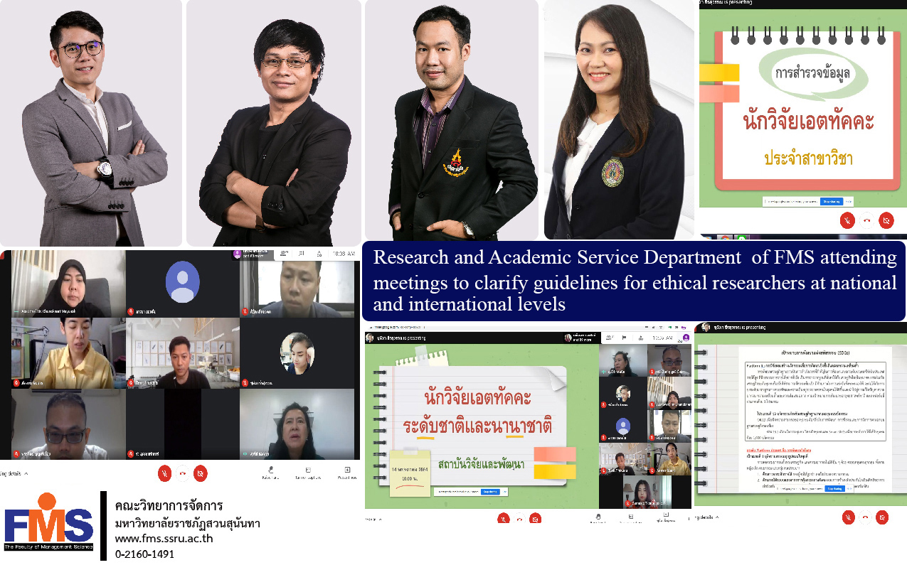On May 14, 2021 at 10:00 am Assistant Professor Dr. Natthaphong Techarattanaset Deputy Dean for Research Along with Prof. Dr. Krisana Chuerchainat, Deputy Dean for Academic Affairs Faculty of Management And branch supervisor / branch supervisor Faculty of Research and Academic Service Personnel Attending meetings to clarify guidelines for ethical researchers at national and international levels Organized by the Research and Development Institute Suan Sunandha Rajabhat University Honored by Assistant Professor Dr. Suwanee Yodchim, Vice President for Research and Development, is chaired by Assistant Professor Dr. Rachana Chandrasa, Director of the Institute of Research and Development. To clarify guidelines for developing ethical researchers And create understanding for researchers with expertise in specialized research areas It has been recognized nationally and internationally. Via the online meeting system Google Meet.