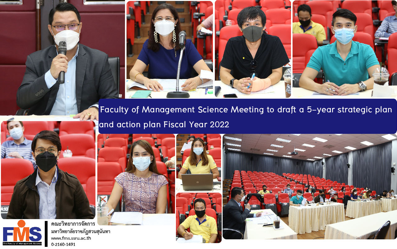 On July 5, 2021 at 1:30 p.m. Faculty of Management Science Suan Sunandha Rajabhat University Organized a meeting on the drafting of the 5-year Strategic Plan (2022-2026) and the Fiscal Year 2022 Action Plan by Assistant Professor Dr. Somsak Klaysung, Dean of the Faculty of Management Science. chair the meeting on important agendas about The drafting of the 5-year strategic plan (2022-2026) and the operational plan for the fiscal year 2022 of the Faculty of Management Speakers, including other relevant agendas There is a committee of administrators for the faculty, vice dean, heads of all departments. Attend the meeting at Mini Theater room, Building 57, 6th floor.