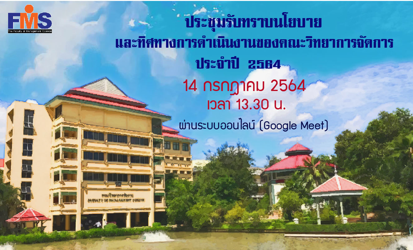 Public relations Dear faculty members and academic support personnel of the Faculty Attend the meeting to acknowledge the policies and directions of operations of the Faculty of Management Science for the year 2021 on Wednesday, July 14, 2021 at 13.30 via online system (Google Meet).
