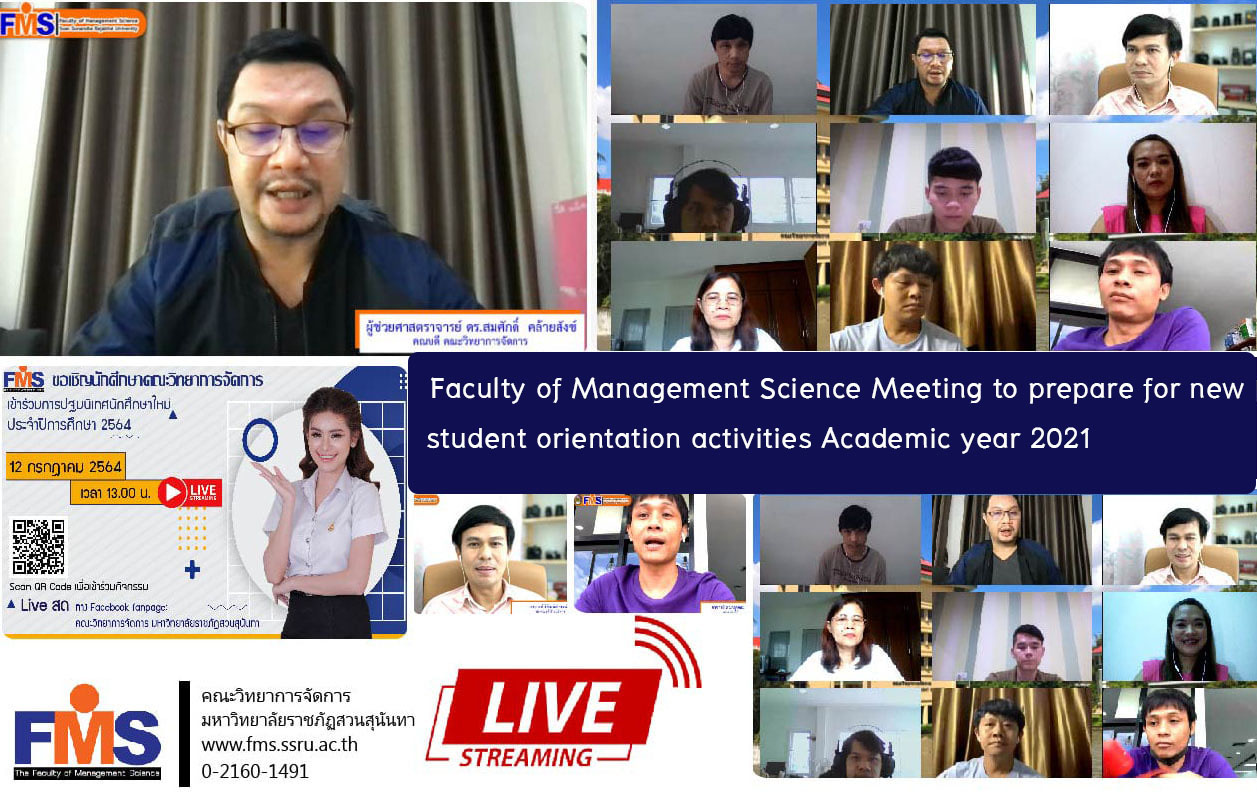 On July 11, 2021 at 2:00 p.m. Faculty of Management Science Suan Sunandha Rajabhat University Organize a meeting to prepare for new student orientation activities for the academic year 2021 by Assistant Professor Dr. Somsak Klaysung, Dean of the Faculty of Management Science chair the meeting together with all dean and the organizing committee of the activities Preparing and planning meetings before the live broadcast for the Faculty of Management Science New student orientation activities are scheduled. Academic year 2021 on Monday, July 12, 2021 at 1:00 PM onwards in the form of a live broadcast via Facebook fanpage: Faculty of Management Science Suan Sunandha Rajabhat University.