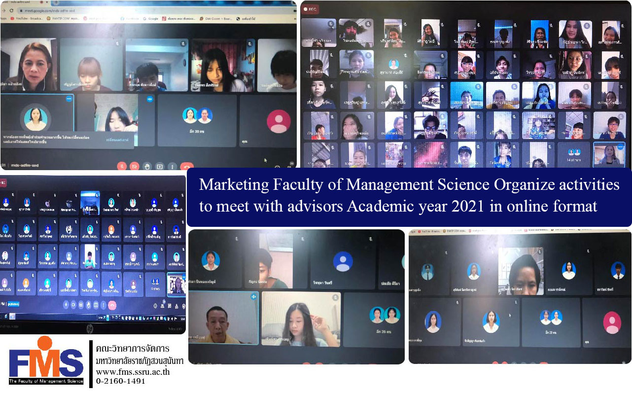 Marketing Faculty of Management Science Suan Sunandha Rajabhat University Organize activities to meet with advisors for the academic year 2021 for first year marketing students in an online format To encourage teachers and students to have the opportunity to meet, talk and exchange ideas with each other. This is to give students confidence. and have time to seek advice from teachers Its goal is to help students succeed in their studies. Happy throughout the period of study There are lecturers in the field to welcome, give sermons, and provide guidance on study throughout the study period. which the atmosphere is warm in online format via Zoom Meeting program.
