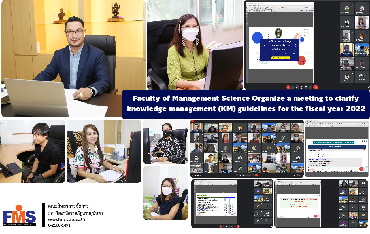 On September 8, 2021 at 1:30 p.m. Faculty of Management Science Suan Sunandha Rajabhat University Organized the Knowledge Management Committee Meeting No. 1/2022 to clarify the knowledge management (KM) guidelines for the fiscal year 2022 by Assistant Professor Dr. Somsak Klaysung, Dean of the Faculty of Management Science. chair the meeting together with Assistant Professor Ladda Hiranyawa, Associate Dean for Planning and Quality Assurance. Participated in clarification of knowledge management (KM) guidelines for fiscal year 2022 by dividing knowledge management operations into 2 groups: a group of faculty members; and the Faculty's Academic Support personnel group, there is an Associate Dean, Head of the Faculty Group head of department and academic support personnel Attend online meetings via Google Meet.