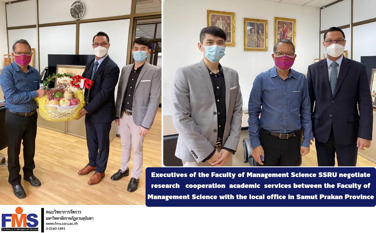 On September 16, 2021, Assistant Professor Dr. Somsak Klaysung, Dean of the Faculty of Management Science, together with Assistant Professor Dr. Natthapong Techaratanaset Associate Dean for Research and Academic Services Mr. Kanmanat Muensang Research Officer Traveled to meet Mr. Teerachai Saenphuwa, Samut Prakan Province local office at Samut Prakan Provincial Office. to discuss ways to collaborate in research and academic services as a guideline for further local development.