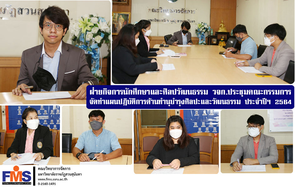 On September 21, 2021, Student Affairs and Art and Culture Department Faculty of Management Science Organize a meeting of the committee to prepare an action plan for the preservation of arts and culture for the academic year 2021, with Dr. Pongsawee Supanonth, Deputy Dean for Student Affairs Faculty of Management Science chair the meeting Preparation of action plans for preserving arts and culture for the academic year 2021 to develop activities for preserving arts and culture have a department head and student affairs staff Attend the meeting at the student club meeting room Faculty of Management Science.