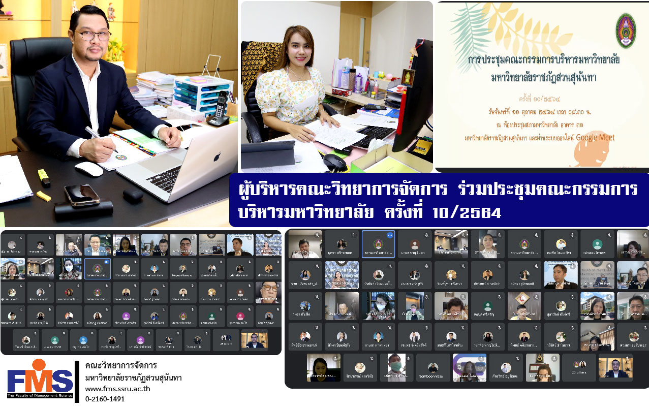 On October 11, 2021 at 09.30, Assistant Professor Dr. Somsak Klaysung, Dean of the Faculty of Management Science along with Ms. Jinjutha Srirao, Head of the Dean's Office Attended the University Administrative Committee Meeting No. 10/2021 by Associate Professor Dr. Chutikarn Sriwiboon, President of Suan Sunandha Rajabhat University chair the meeting There are university administrators, faculties, departments, campuses, education centers. Attend online meetings via Google Meet.