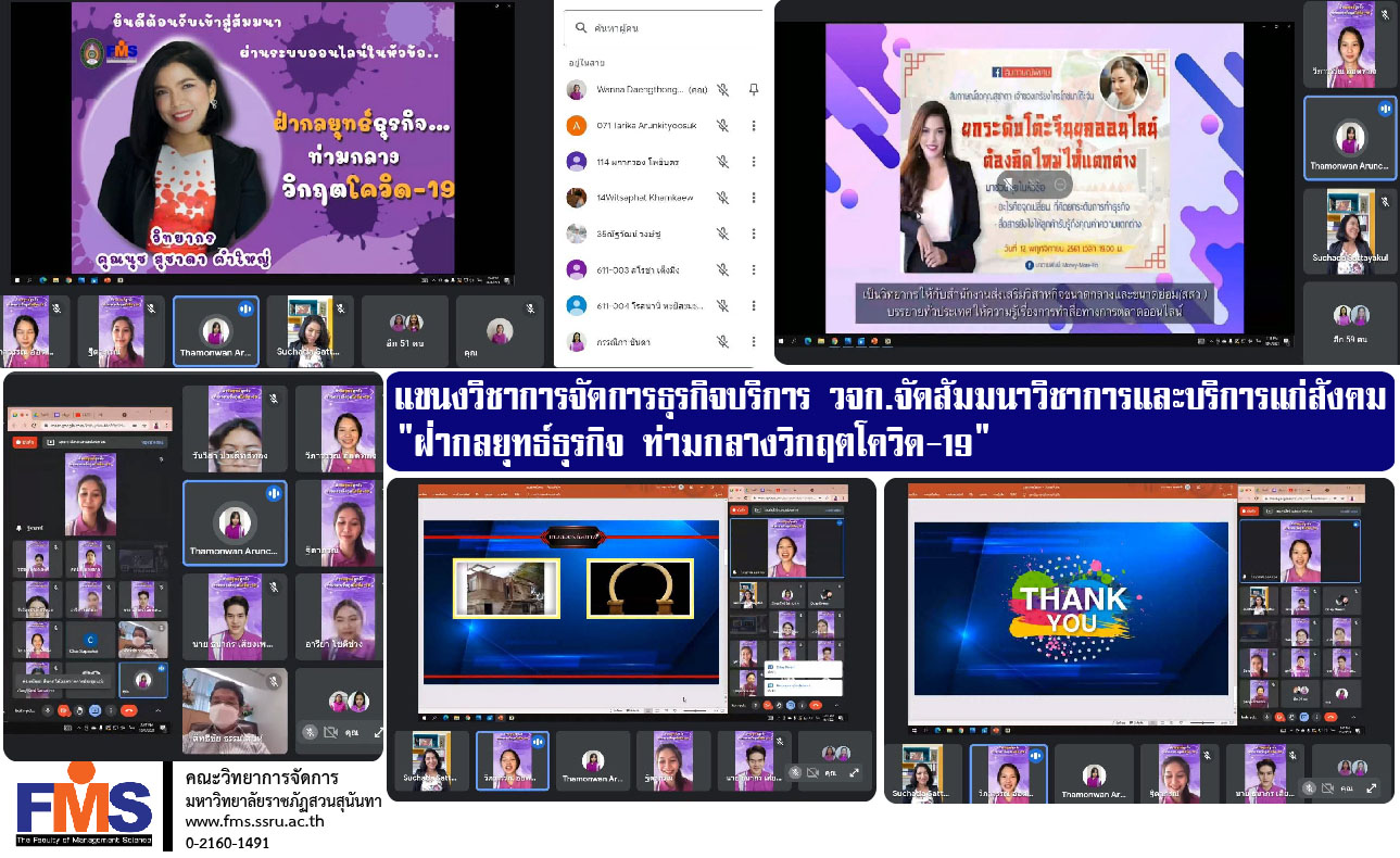 Service business management student, group 001 (group 2), Faculty of Management Science Organized an academic seminar and service to society on the topic "Breaking Business Strategies in the midst of the COVID-19 crisis" via online system via Google Meet program which was honored by Mr. Suchada Khamyai (Owner of Nakhon Pathom Cattering Business - Chinese Table) as a speaker to give knowledge and share experiences with the participants. seminar The speakers gave the main idea which is the concept from this lecture that "great success Can't do it alone Must have a strong team And have loyalty to the organization" This seminar has achieved all objectives. with Assistant Professor Dr. Sittichai Thammasane as the project advisor.