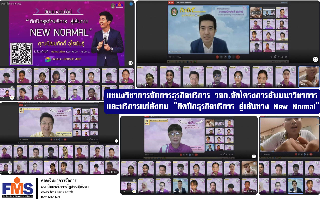 Recently service business management student, group 002 (group 1), Faculty of Management Science Organized an academic seminar and social service project titled "Adhere to Service Business Wings to the New Normal Path" via online system via Google Meet program, which was honored by Ajarn Pimsak Uraiphan, President of BSP Training Institute, as a speaker for knowledge and exchange. Direct experience with seminar attendees by the main idea that the speaker has said "Use wisdom All knowledge and experience pull yourself into the sky and that we will be successful must have goals must turn his head in the right direction and then use all the energy available to "fly" and attach wings to our own lives". with Assistant Professor Dr. Sittichai Thammasane as the project advisor.