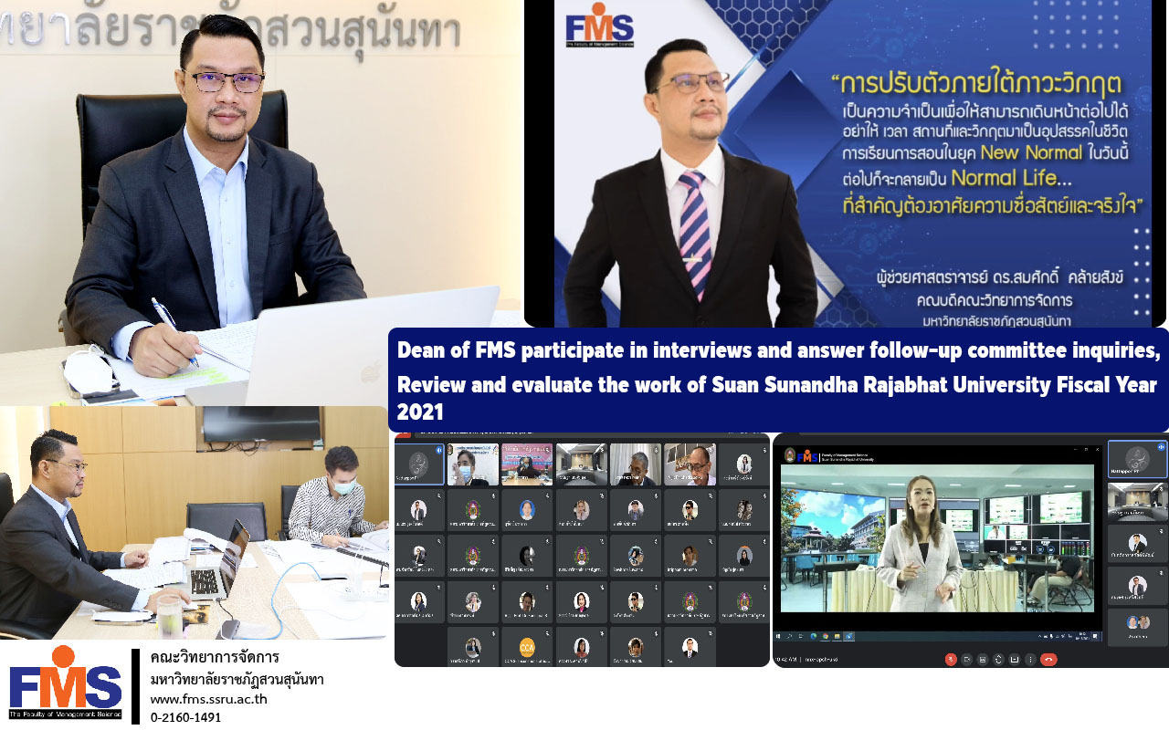 On October 18, 2021 at 9 a.m. Assistant Professor Dr. Somsak Klaysung, Dean of the Faculty of Management Science participate in interviews and answer follow-up committee inquiries. Review and evaluate the work of Suan Sunandha Rajabhat University for the fiscal year 2021 with a follow-up committee check and evaluate the work visit the works of each department which the Faculty of Management Science is considered for selection receive informational presentations, interviews and answer questions. by presenting the video media to the monitoring committee in the form of an online meeting, Google Meet.