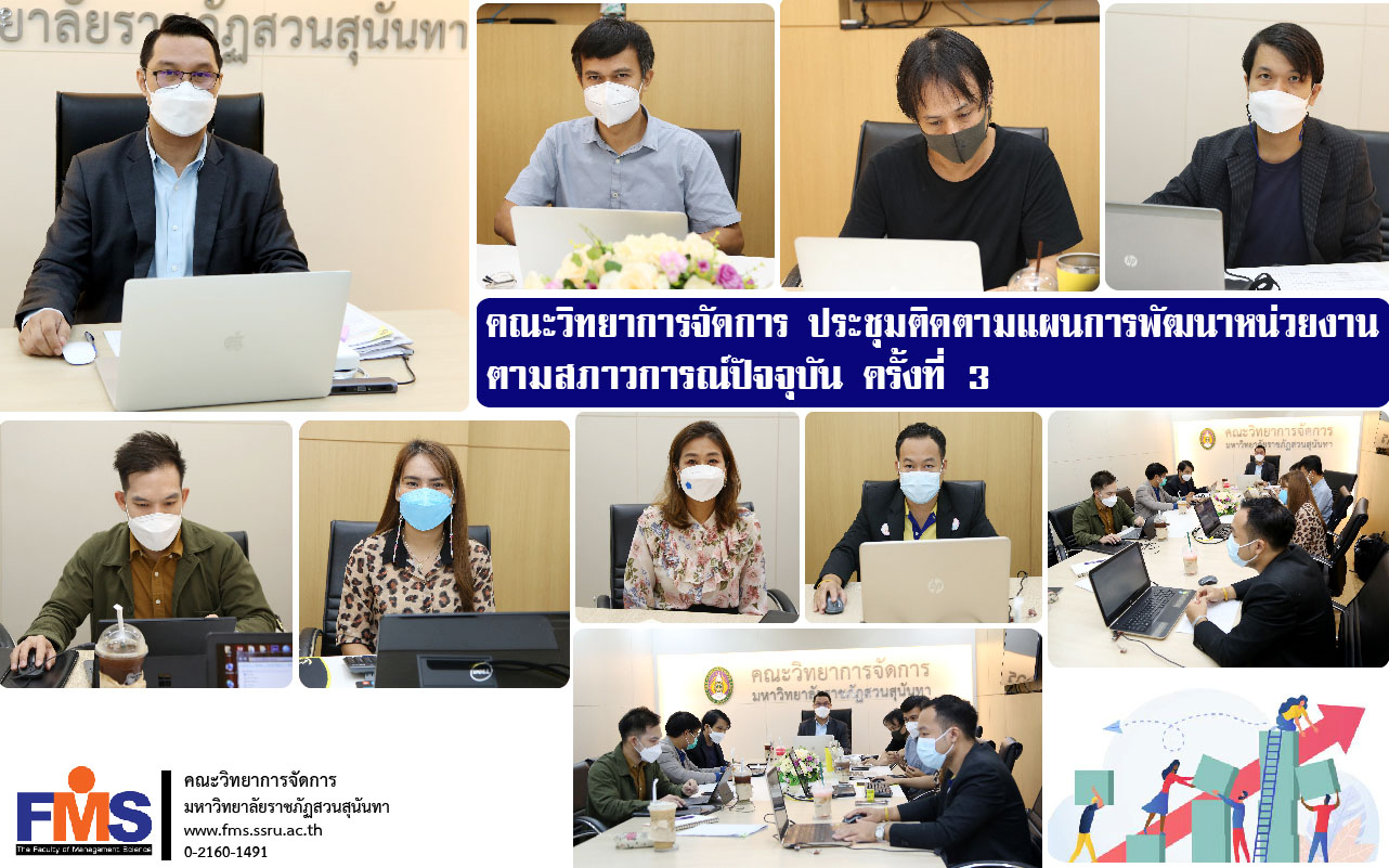 On November 1, 2021 at 9.30 a.m. Faculty of Management Science The 3rd meeting to follow up on the development plan according to the current situation by Assistant Professor Dr. Somsak Klaysung, Dean of the Faculty of Management Science, chair the meeting There is an Associate Dean for all departments. Head of Dean's Office and acting Head of Planning and Quality Assurance Acting Head of Research Development and Academic Services Attended the meeting at the meeting room, Ruam Jai Management, Building 56, 1st floor.