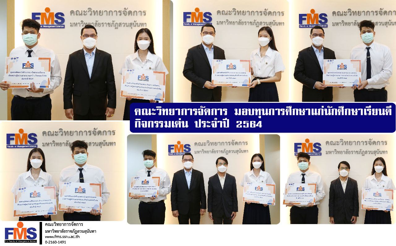 On November 2, 2021, Faculty of Management Science, Suan Sunandha Rajabhat University has given scholarships to students types of scholarships for knowledge, abilities and outstanding activities It was honored by Assistant Professor Dr. Somsak Klaysung, Dean of the Faculty of Management Science as a scholarship giver with professor Dr. Pongsawee Supanonth, Deputy Dean for Student Affairs Join to honor and congratulate students who received such scholarships. There are 2 scholarships for students who have received scholarships for knowledge, abilities and outstanding activities as follows: