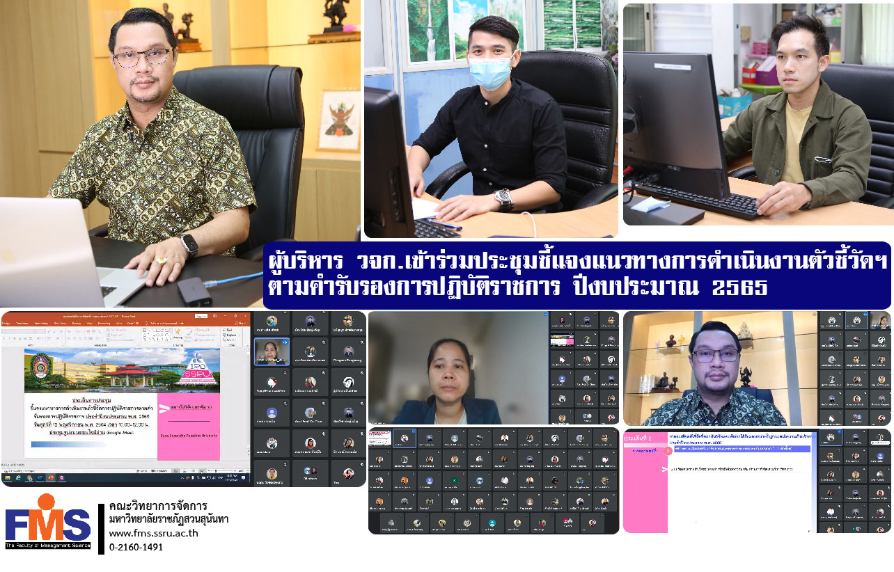 On November 12, 2021 at 9.30 a.m. Executives of the Faculty of Management Science Led by Assistant Professor Dr. Somsak Klaysung, Dean of the Faculty of Management Science. Assistant Professor Dr. Natthapong Techaratanaset Associate Dean for Research and Academic Services and Dr. Itthipoom Phromma, Associate Dean for Planning and Quality Assurance Attended the meeting to explain the operational guidelines of government performance indicators according to the official performance certificate Fiscal Year 2022 by Assistant Professor Dr. Rotchana Chantrasa, Director of Research and Development Institute Suan Sunandha Rajabhat University chair the meeting in the form of an online meeting via the Google Meet system.