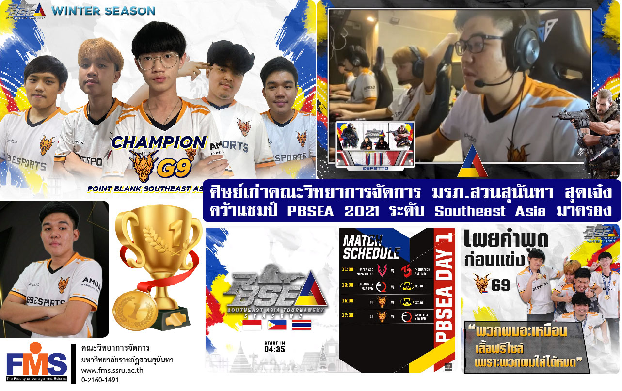 Mr. Patchara Kingkan, alumni of the Faculty of Management Science Suan Sunandha Rajabhat University One of the members of the G9 (Thailand) team, representing Thailand in PBSEA 2021, was able to show a boiling form, defeating the toughest team from Indonesia, winning the PBSEA 2021 championship and winning the prize money of $ 2,000 successfully. Live broadcast on Youtube : PointBlank Thailand when Date 18 December 2021 ago.
