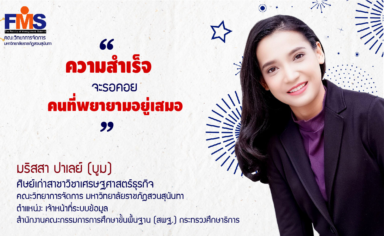 Boom, a senior alumnus in business economics. Faculty of Management, Science Suan Sunandha Rajabhat University It is a guideline for the decision to enter further education of the students. There is also a small message to the juniors who are deciding to study business economics.
