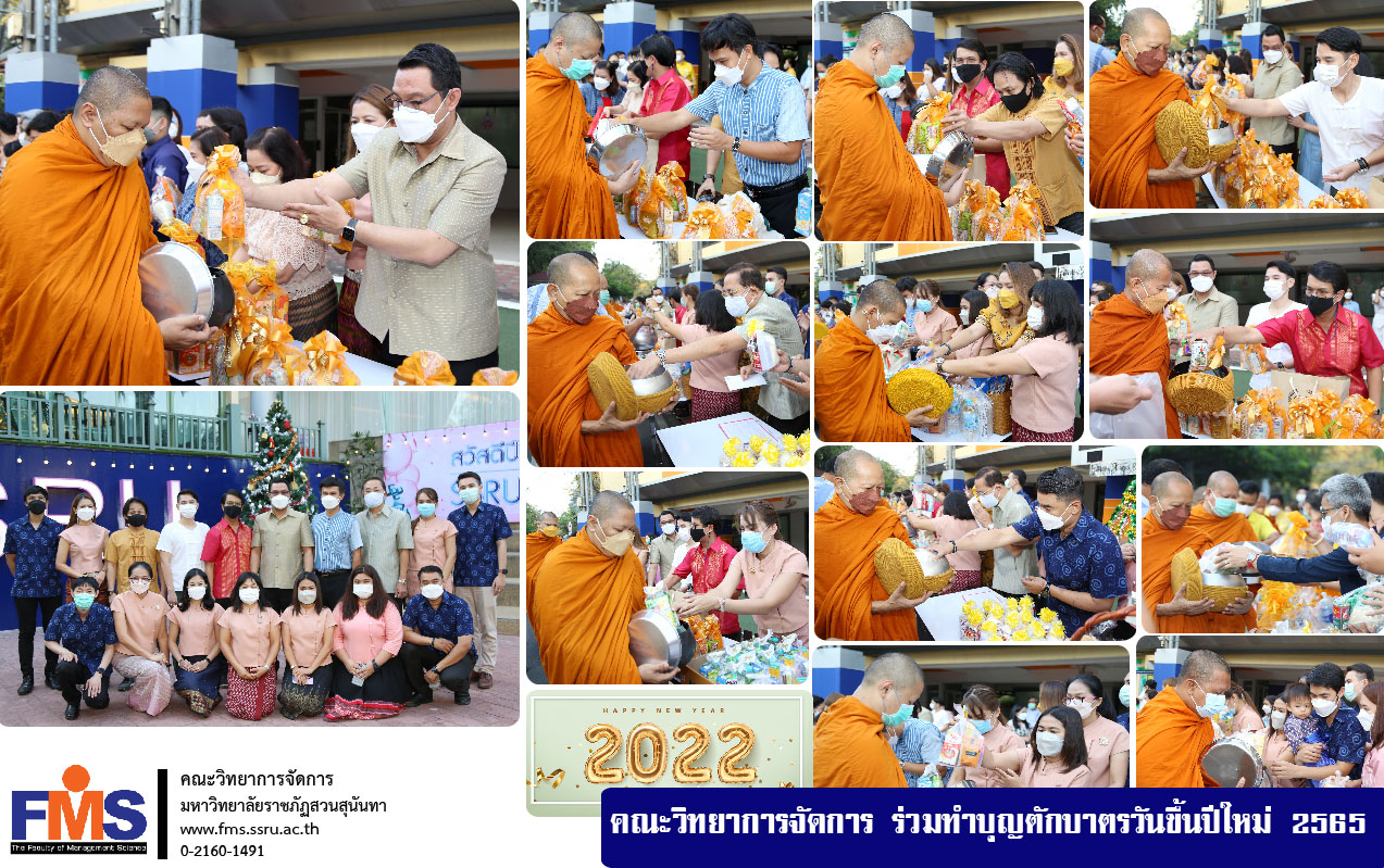 On December 27, 2021 at 7:00 a.m. Assistant Professor Dr. Somsak Klaysung, Dean of the Faculty of Management Science along with Deputy Dean, faculty and staff join the rice alms offering ceremony dry food for 15 monks on the occasion of the new year 2022 organized by Suan Sunandha Rajabhat University at the front of the Office of the President, Building 31.