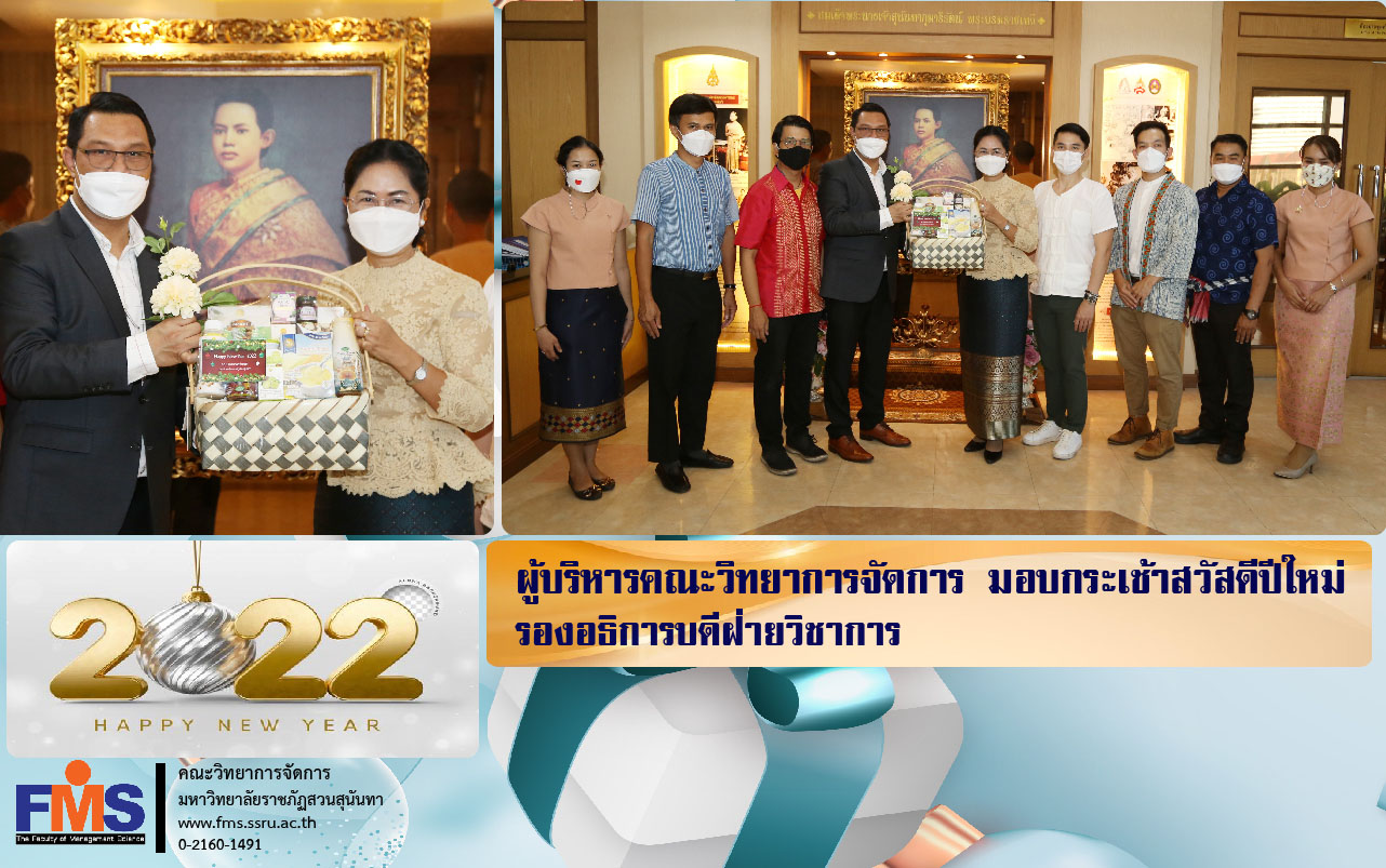 On December 27, 2021, the Faculty of Management Science, led by Assistant Professor Dr. Somsak Klaysung, Dean, together with Associate Dean Head of Dean's Office met and gave a New Year's gift basket to Associate Professor Dr. Nanthiya Noichan, Vice President for Academic Affairs On the occasion of the end of the year and welcome the new year 2022 at the Office of the President, 5th floor, Suan Sunandha Rajabhat University.