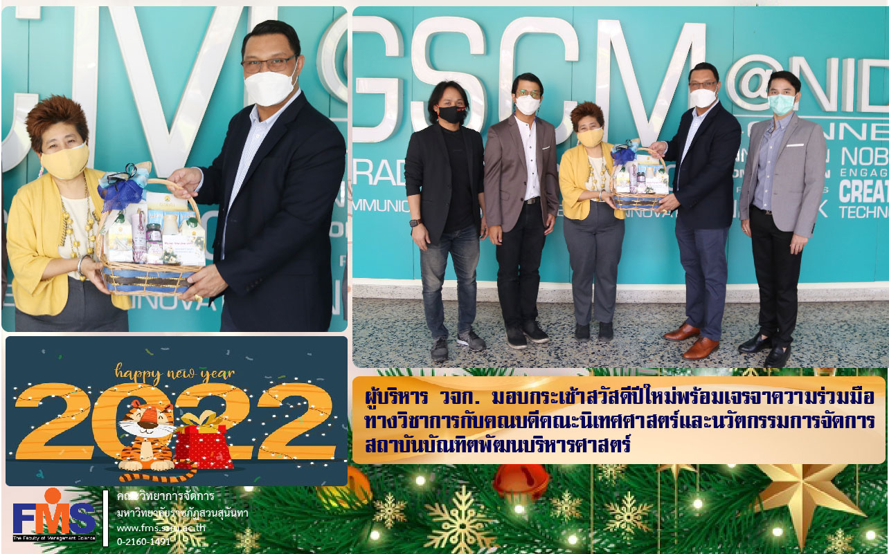 On January 10, 2022, the Faculty of Management Science, led by Assistant Professor Dr. Somsak Klaysung, Dean, together with Associate Dean met and gave a New Year's gift basket to Associate Professor Dr. Kulthip Sataruchi, Dean of the Faculty of Communication Arts and Management Innovation National Institute of Development Administration On the occasion of New Year's Day 2022, as well as negotiating guidelines for academic cooperation between 2 institutions at Malaihuwanan Building Faculty of Communication Arts and Management Innovation National Institute of Development Administration Bangkok.