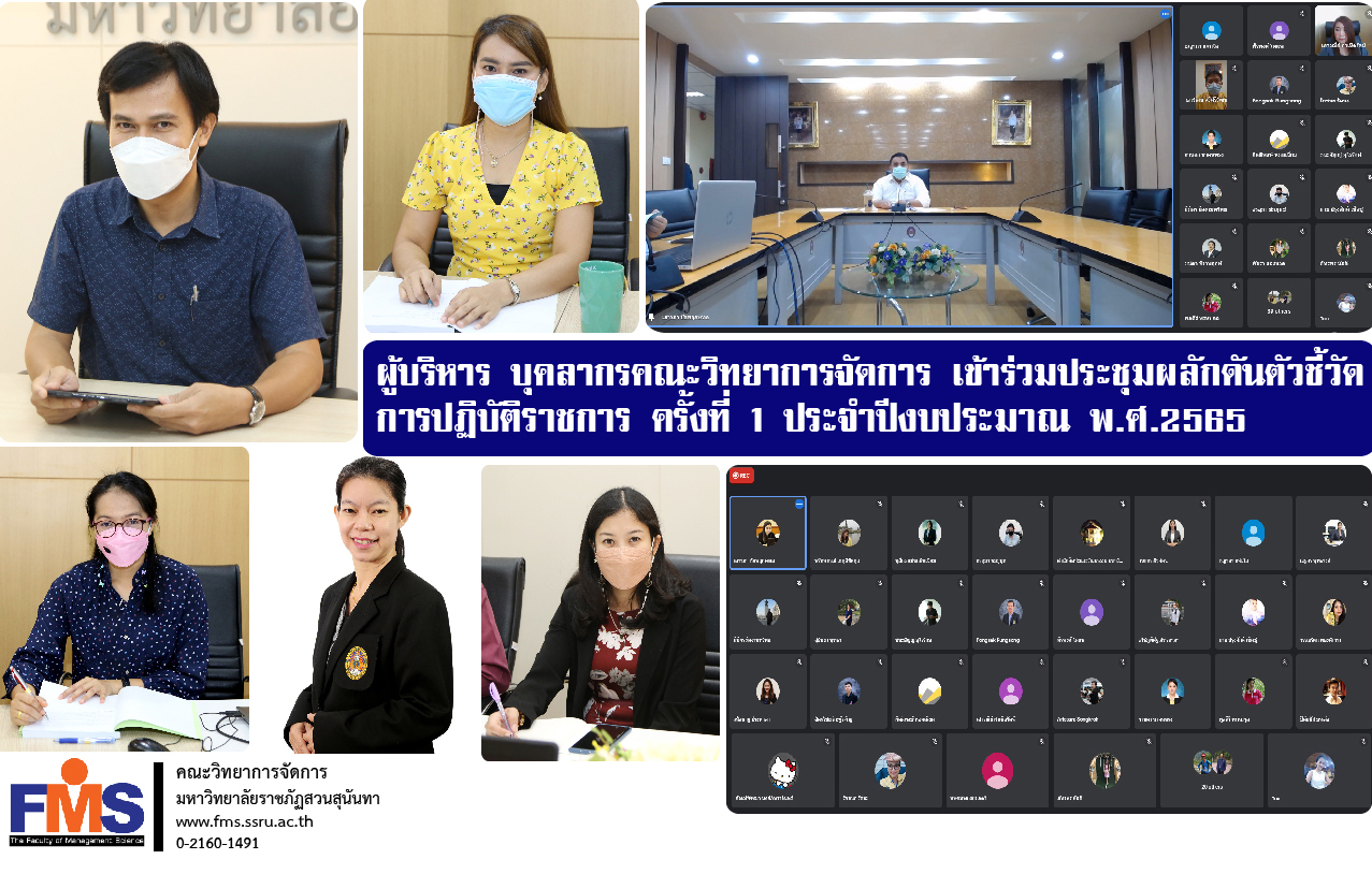 On February 28, 2023, Mr. Pitimanas Bunlue, Deputy Dean for Administration Faculty of Management Science together with Ms. Jinjuta Srirao, Head of the Dean's Office, Ms. Phakaporn Dechanan, Head of General Administration Ms. Poonsiri Phromkul, Planning and Quality Assurance Officer and Ms. Arisara Songkroh, Secretary of the Dean of the Faculty of Management Science. Attended the 1st meeting to push the performance indicators of the fiscal year 2022 by Assistant Professor Dr. Komsan Somanwat, Vice President of Nakhon Pathom Campus. chair the meeting via the online system Google Meet.