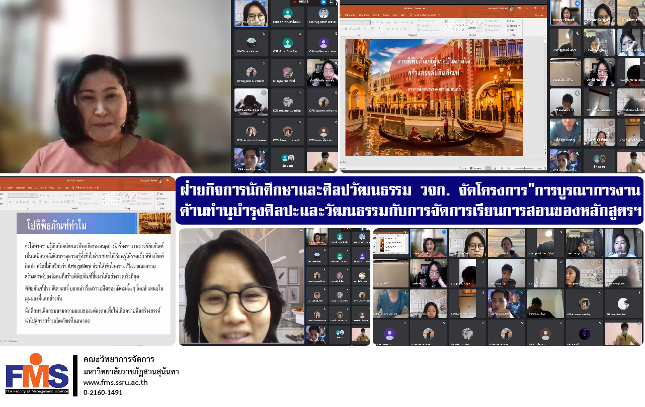 Student Affairs and Arts and Culture Department, Faculty of Science, together with the Business Administration Program Marketing Academic Division organized a project "Integrating the work of preserving arts and culture with teaching and learning management of the academic year 2021 curriculum" run by Assistant Professor Dr. Warangkana Chitrapan, a lecturer in the course. creative management and product development for organizing such projects Was honored by Dr. Warangkana Niyirit as a speaker on the topic From a museum to product inspiration To educate students of the Faculty of Management Science via the online system Google Meet.