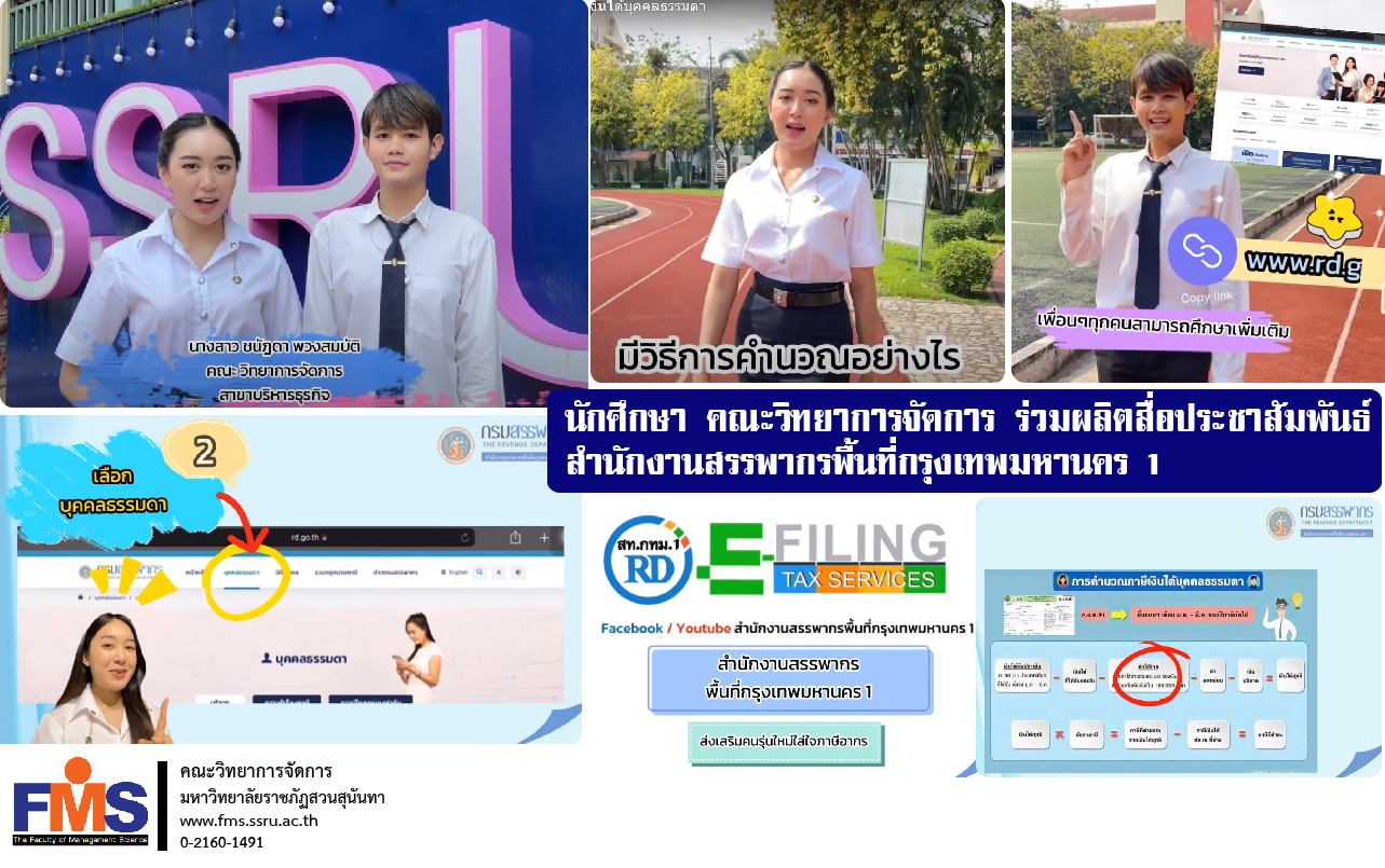 Faculty of Management Science students Suan Sunandha Rajabhat University consists of Ms. Chanatda Phuangsombat, Mr. Inthanon Niansanthea, Ms. Naphassorn Tulpirom, Mr. Patcharaphon Farmer and Ms. Parichart Ruangrak from Business Administration. Co-production of public relations media Bangkok Area Revenue Office 1 Ep. Calculation of personal income tax in activities "Promoting the new generation Pay attention to taxation.” You can watch the knowledge media at Facebook : https://www.facebook.com/100067386084140/posts/279967080926159/?d=n YouTube : https://youtu.be/HLL7tiYzXUE