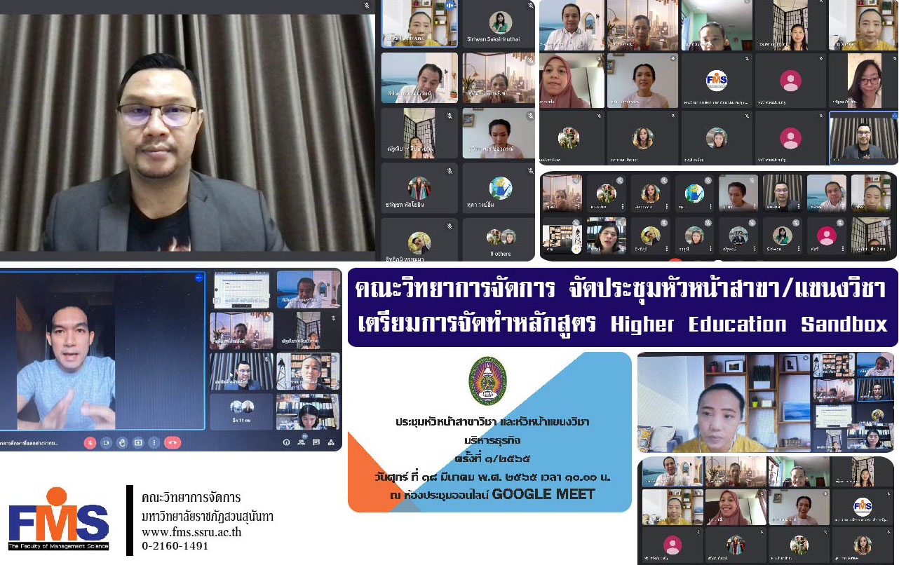 On March 18, 2022, Faculty of Management Science Suan Sunandha Rajabhat University Organize a meeting of the head of the department Head of Business Administration Department No. 1/2022 by Assistant Professor Dr. Somsak Klaysung, Dean of the Faculty of Management Science chair the meeting Regarding the request to open an educational program that is different from the Higher Education Sandbox and other related agendas There is a group leader in the business service department. head of department and heads of departments attend the meeting in the form of an online meeting through the Google Meet program.