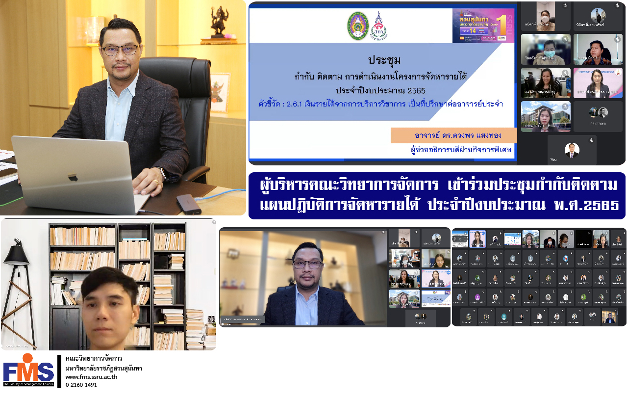 On March 22, 2022, Assistant Professor Dr. Somsak Klaysung, Dean of the Faculty of Management Science along with Assistant Professor Dr. Natthaphong Techaratanaset Associate Dean for Research and Academic Services Attending meetings to supervise and follow up on revenue procurement action plans Fiscal Year 2022 (Quarter 2) to monitor the fiscal year 2022 calendar year via Google Meet online system.