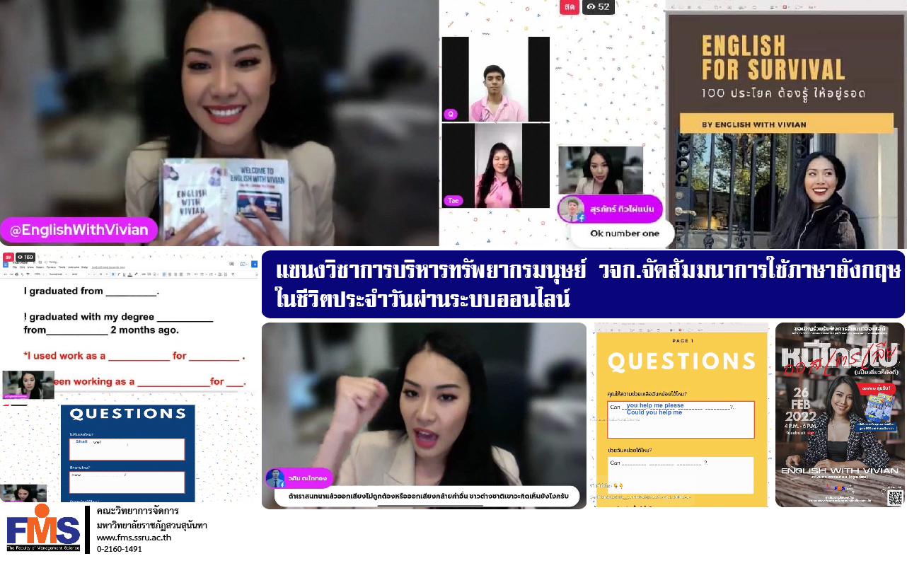 Student of Human Resource Management, Class 62, Study Group 002, Faculty of Management Science Suan Sunandha Rajabhat University Organized an online seminar on the use of English in daily life under the topic "It's good for you to escape Thailand to Australia for a moment", which the project organizers recognized the importance of using English in the present and its use in English. job duties including doing business The objective is to provide benefits in using English and sharing experiences of doing business and studying abroad. to the people who participated in this seminar It was honored by Ms. Duangkaew Siriworakasem (Kru Vivian), owner of the English with Vivian page, as a speaker. In the form of live streaming through the Facebook Fanpage page and there is also a lucky draw event to receive prizes. English books outside the classroom, 3 prizes during the online seminar There are many people who are interested in participating in the event. For organizing the project, there was Mr. Anop Panpuang, a lecturer in the field of human resource management. As a project advisor.