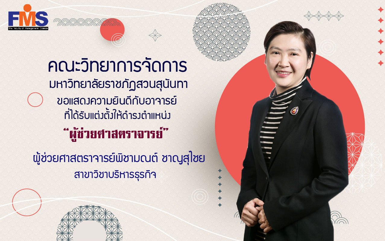 Faculty of Management Science Suan Sunandha Rajabhat University Congratulations to Assistant Professor Phichamon Chansuchai on the occasion of Suan Sunandha Rajabhat University Council At the meeting no. 3 / 2022, Wednesday, March 30, 2022, it was resolved to approve the appointment of a higher academic position. "Assistant Professor" in Business Administration.