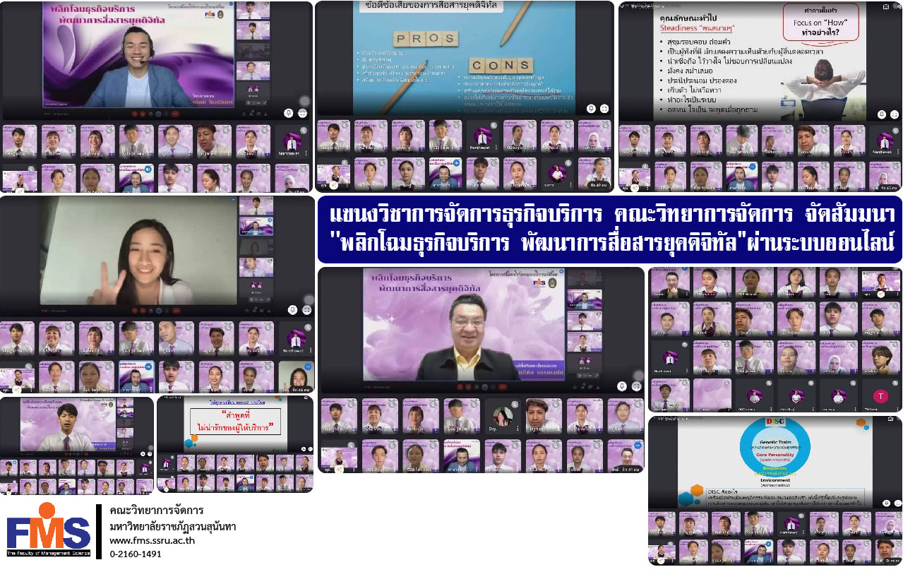 Service business management student, group 002 (group 1), Faculty of Management Science Organized an academic seminar and service to society on the topic of ''transforming service business' Developing communication in the digital age" through an online system with the Google Meet program, which was honored by Mr. Suthat Yai-in as a speaker to give knowledge and share experiences with the seminar participants. The main idea that the speaker said: "Short, simple, practical", which the seminar organizers saw the communication problem. in customer service Therefore, the same ideas can be applied, but we need to be more open to changing the way we communicate with new processes. The organization of the aforementioned seminar has achieved its objectives. with Assistant Professor Dr. Sittichai Thammasane as the project advisor.