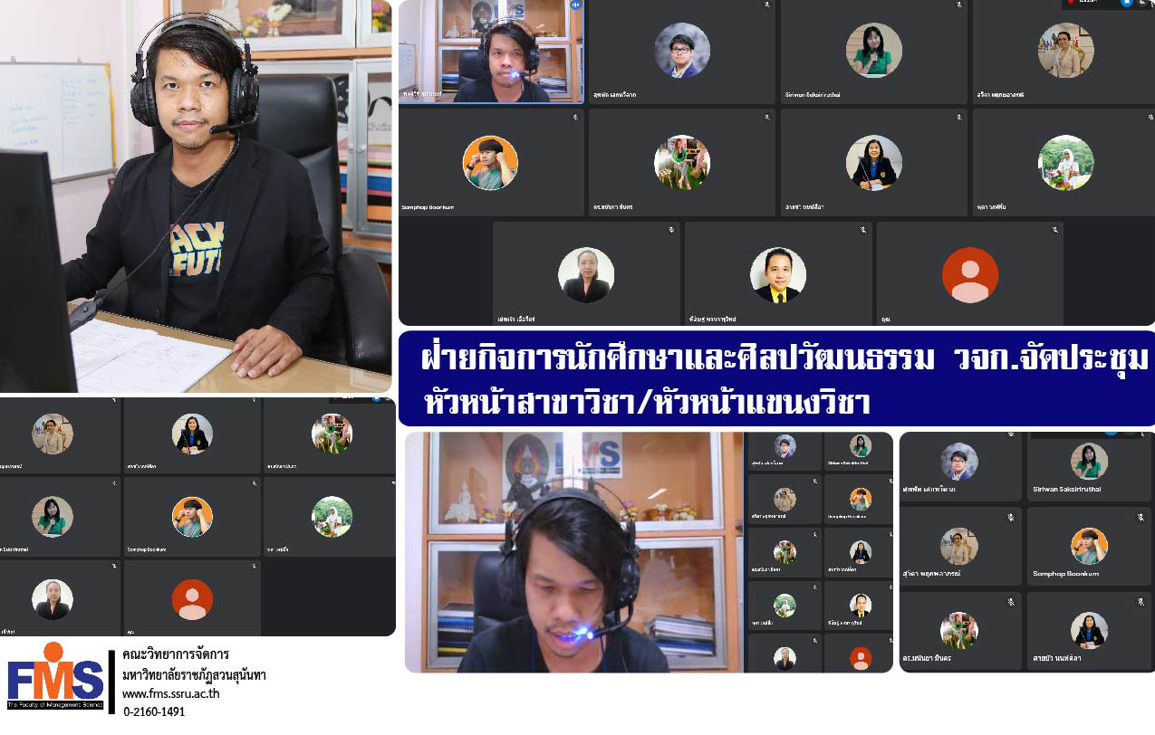 On May 27, 2022 at 1:00 p.m. Student Affairs and Art and Culture Department Faculty of Management Science Organized a meeting of heads of departments/heads of departments with Professor Dr. Pongsawee Supanonth, Associate Dean for Student Affairs and Arts and Culture. chair the meeting To clarify the process of organizing a meeting of the Vice President for Student Affairs to meet with the alumni of the Faculty of Management Science (online) to be held on May 29, 2022, as well as to publicize the activities of the Business Plan Contest (SME) and the 85th Anniversary Activities, Sunandha Park, which will Consisting of the 3rd Half Marathon Walk-Run Fair, Chao Wang Market and the project to help mother send a 85-year-old student 85 baht with a head of the department / head of the department Attend online meetings with the Google Meet program.