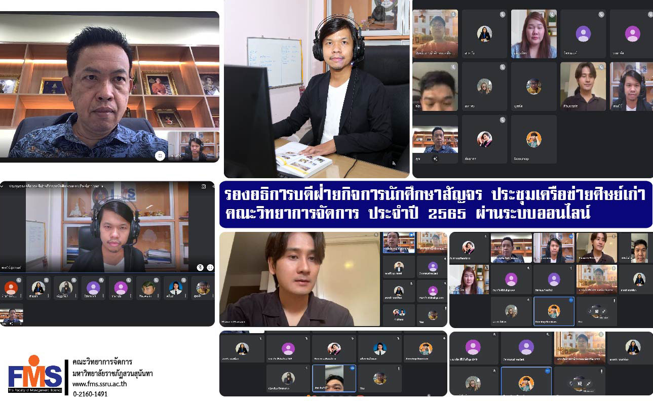 On May 29, 2022, Student Affairs and Art and Culture Department The Faculty of Management speakers led by Dr. Pongsawee Supanonth, Associate Dean for Student Affairs and Arts and Culture. along with the personnel of the department to welcome Assistant Professor Dr. Jetsarit Angsukanchanakul Vice Rector for Student Affairs Chairperson of the Alumni Network Meeting Faculty of Management Sciences under the name "Vice President for Student Affairs Traveling" has alumni who graduated from the Faculty of Management Science. Attend the meeting and listen to the guidelines for the implementation of activities and operations related to the alumni in the form of an online meeting via Google Meet.