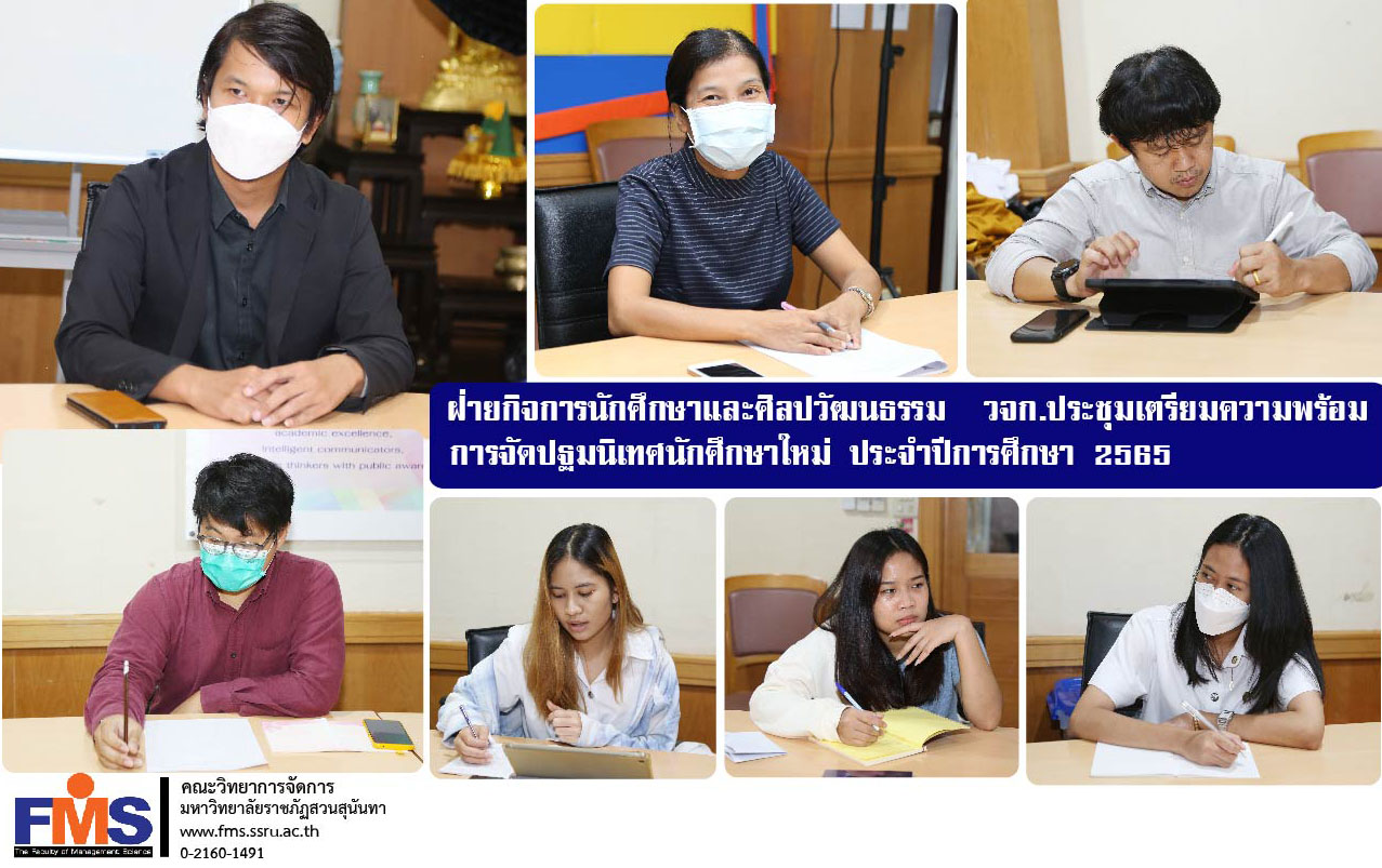 On June 16, 2022, Student Affairs and Art and Culture Department Faculty of Management Science with the student club Faculty of Management Science arrange a preparatory meeting Orientation for new students Academic Year 2022 by Professor Dr. Pongsawee Supanonth, Associate Dean for Student Affairs and Art and Culture chair the meeting There is a faculty who operates the student affairs department. Faculty Student Club Attended the meeting at the student club meeting room Faculty of Management Science.