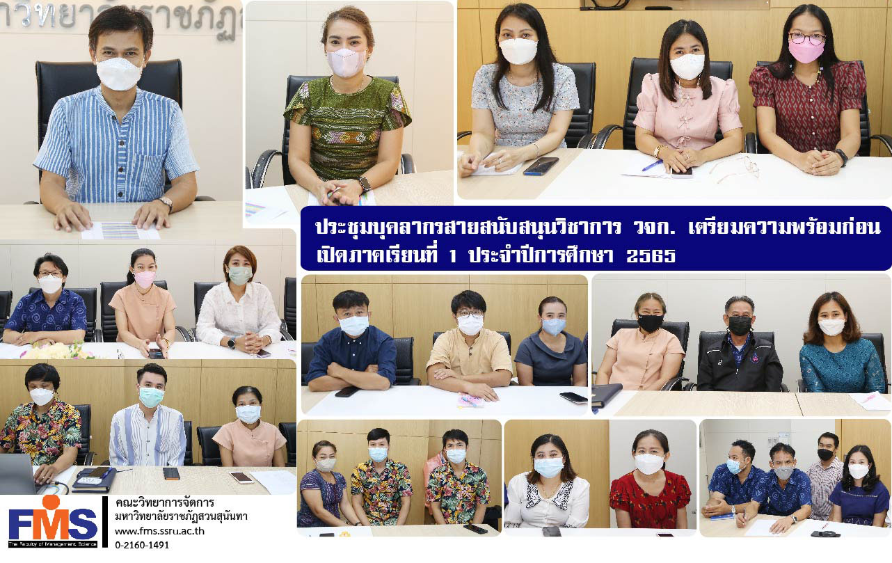 On June 24, 2022, Faculty of Management Science Suan Sunandha Rajabhat University Organize a meeting for academic support personnel by Mr. Pitimanas Bunlue, Associate Dean for Administration chair the meeting along with the head of the Dean's Office All department heads and academic support personnel of the Faculty attend the meeting To acknowledge the guidelines for performing duties during the opening of the first semester of the academic year 2022 at the Ruamjai Management Conference Room. Faculty of Management Science.