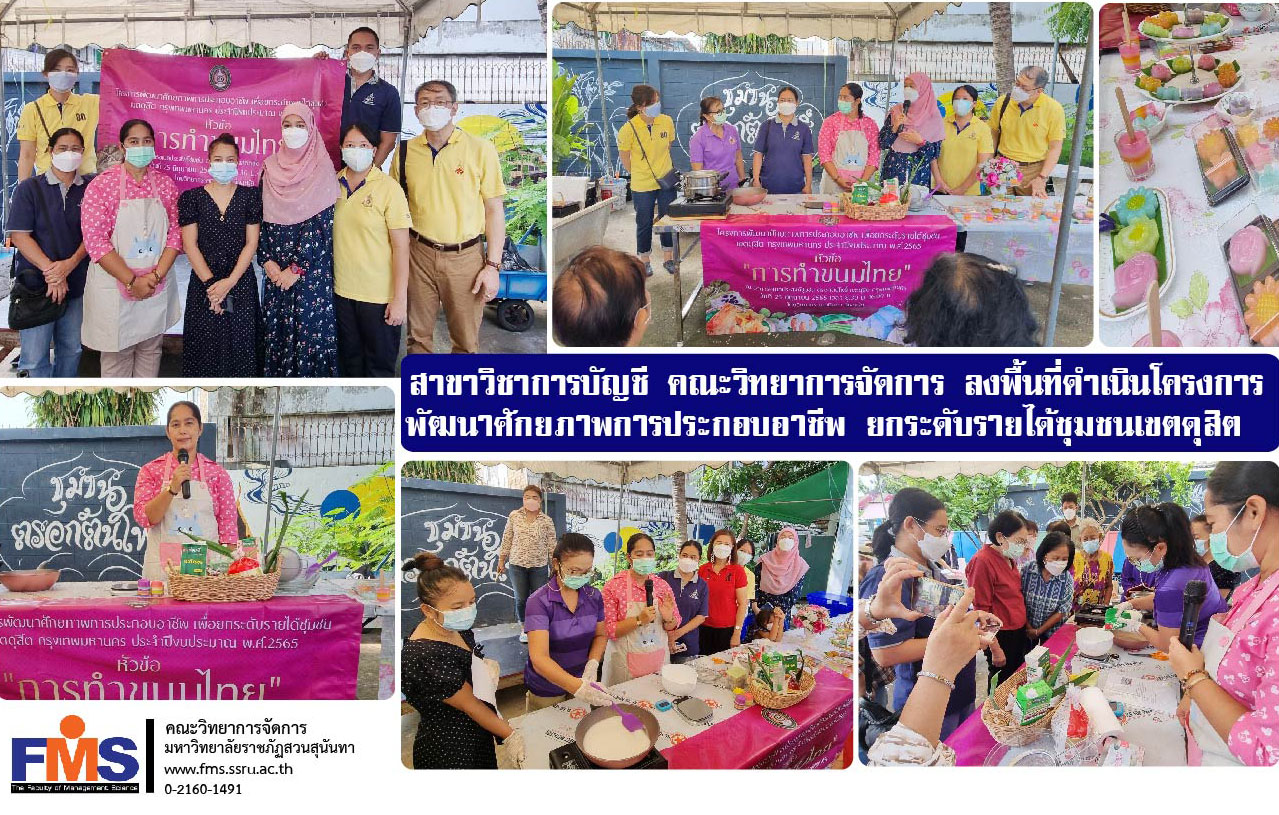 On June 25, 2022, Dr. Huda Wongyim, Head of Accounting Department Faculty of Management Science Suan Sunandha Rajabhat University along with a lecturer in the accounting department and Pol. Col. Werayut Srichantra, an alumnus of the accounting department. Go to the area to organize a project to develop occupational potential To raise the income of the community in Dusit Bangkok Fiscal Year 2022, with an honor from Khun Nittaya Nimlamai, an expert in confectionery as a speaker to convey knowledge about Thai dessert making Demonstration of making desserts for community members at Ton Pho Community, Dusit District, Bangkok.