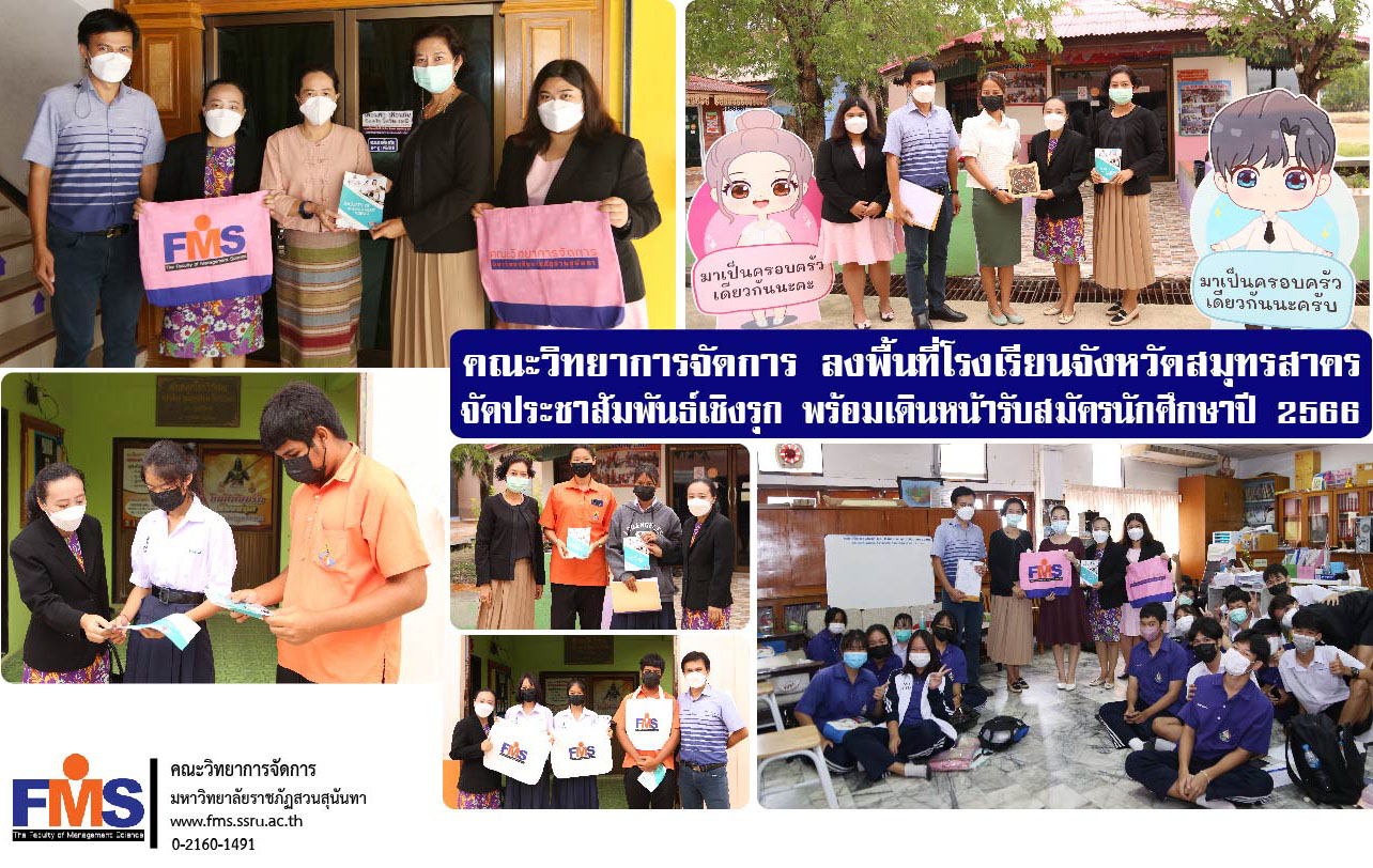 On July 12, 2022, the Faculty of Management Science Suan Sunandha Rajabhat University led by Mr. Pitimanas Bunlue, Deputy Dean for Administration Faculty of Management Science along with Ms. Premjai Uajit, Head of the Department of Human Resources Management and Miss Kajeerat Poompruek, a Lecturer in the Department of Human Resource Management. and personnel team Field visits to schools in Samut Sakhon Province, including Phanthai Norasing Wittaya School Samut Sakhon Burana School and Samut Sakhon Wittayalai School Implementing proactive public relations projects According to the policy of focusing on proactive public relations of Assistant Professor Dr. Somsak Klaysung, Dean of the Faculty of Management Science. in information publicity Guidance on further studies in the Faculty of Management Science Suan Sunandha Rajabhat University To prepare for the new student recruitment year 2023, which has a warm welcome from teachers and students.