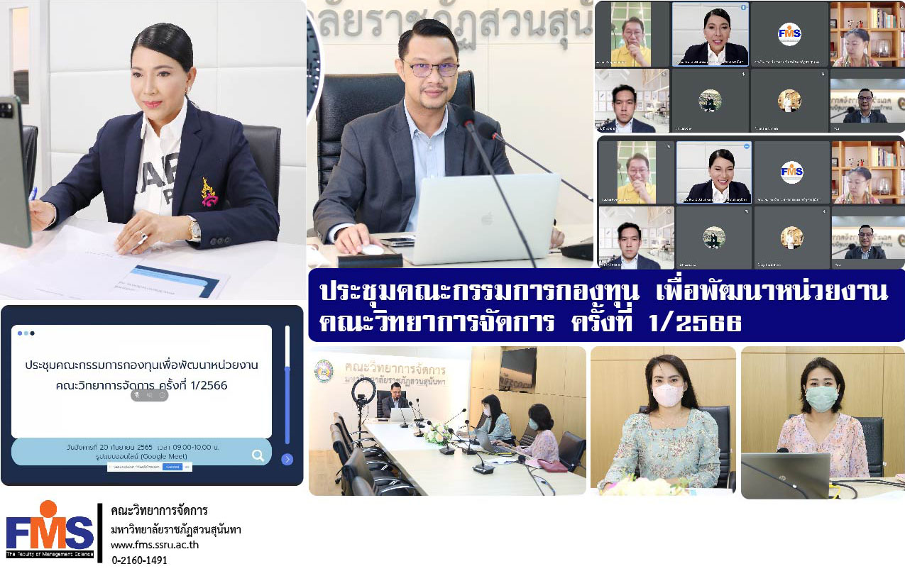 On September 20, 2022, Faculty of Management Science Suan Sunandha Rajabhat University Organize a meeting of the fund committee to develop the agency Faculty of Management Science No. 1/2566 by Associate Professor Dr. Chutikarn Sriwiboon, President of Suan Sunandha Rajabhat University chair the meeting together with Assistant Professor Dr. Somsak Klayung, Dean of the Faculty of Management Science, Ajarn Dr. Itthipoom Phromma, Associate Dean for Planning and Quality Assurance; and the Fund Committee attend the meeting in the form of an online meeting with the Google Meet program.
