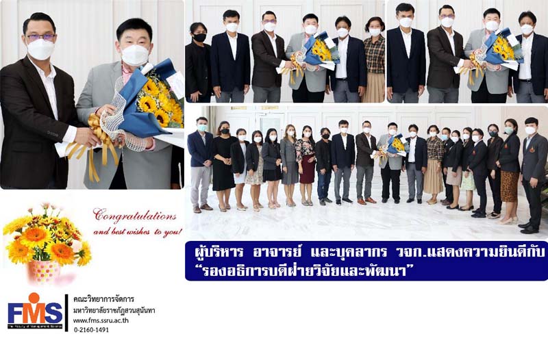 On September 21, 2022, Assistant Professor Dr. Somsak Klaysung, Dean of the Faculty of Management Science along with Associate Dean, Lecturer and Academic Support personnel of the Faculty Congratulations on giving bouquets of flowers To Associate Professor Dr. Bundit Phangnirand on the occasion of being appointed by the Suan Sunandha Rajabhat University Council At the meeting no. 9/22, he was appointed as Vice President for Research and Development. Suan Sunandha Rajabhat University at the Office of the President, Building 31, 1st Floor.