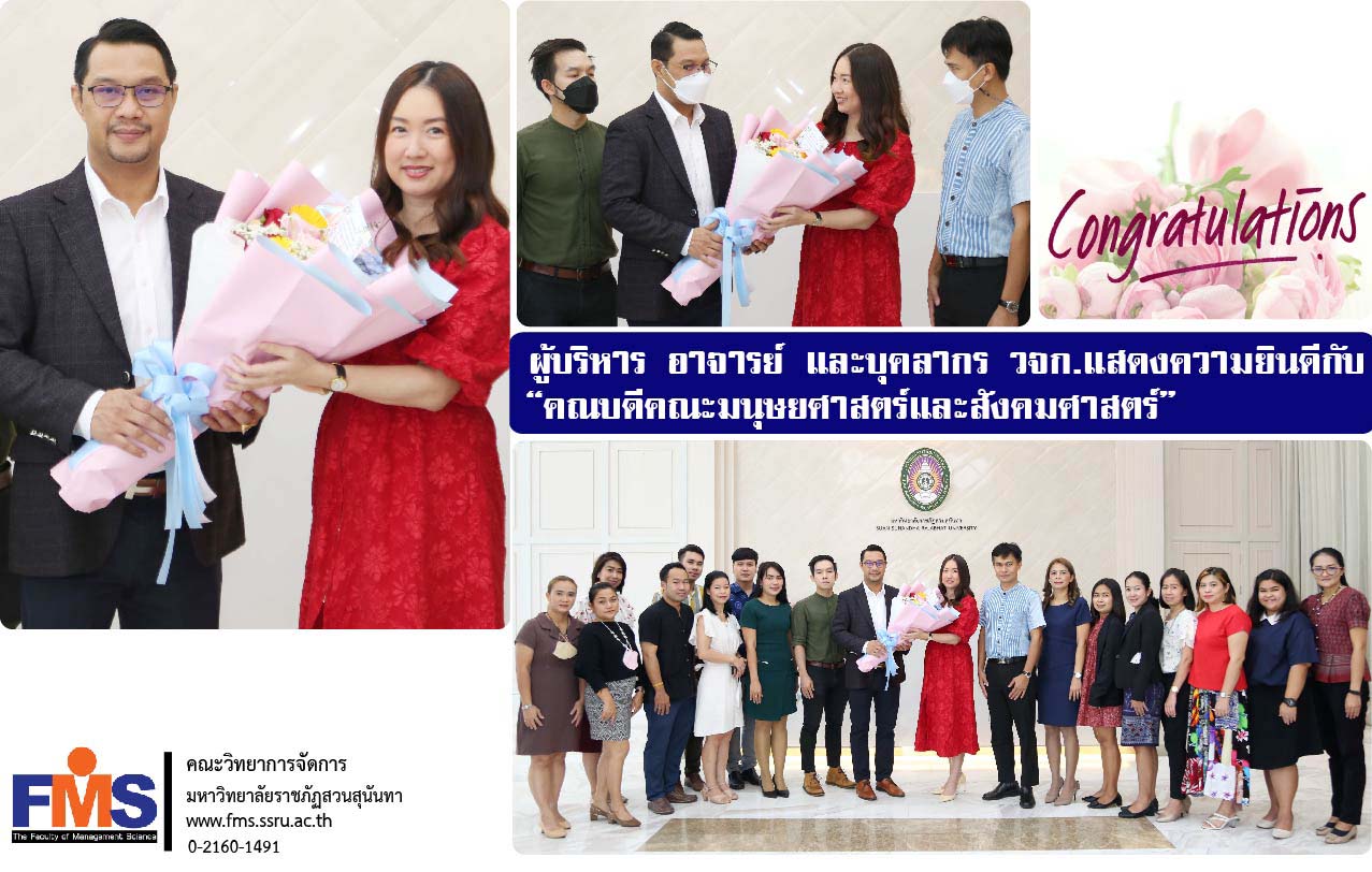 On September 30, 2022, Assistant Professor Dr. Somsak Klaysung, Dean of the Faculty of Management Science along with Associate Dean, Lecturer and Academic Support personnel of the Faculty Congratulations on giving bouquets of flowers To Mrs. Napasri Suwanachot on the occasion of being appointed by the Suan Sunandha Rajabhat University Council At the meeting no. 9/22, he was appointed Dean of the Faculty of Humanities and Social Sciences. Suan Sunandha Rajabhat University at the Office of the President, Building 31, 1st Floor.