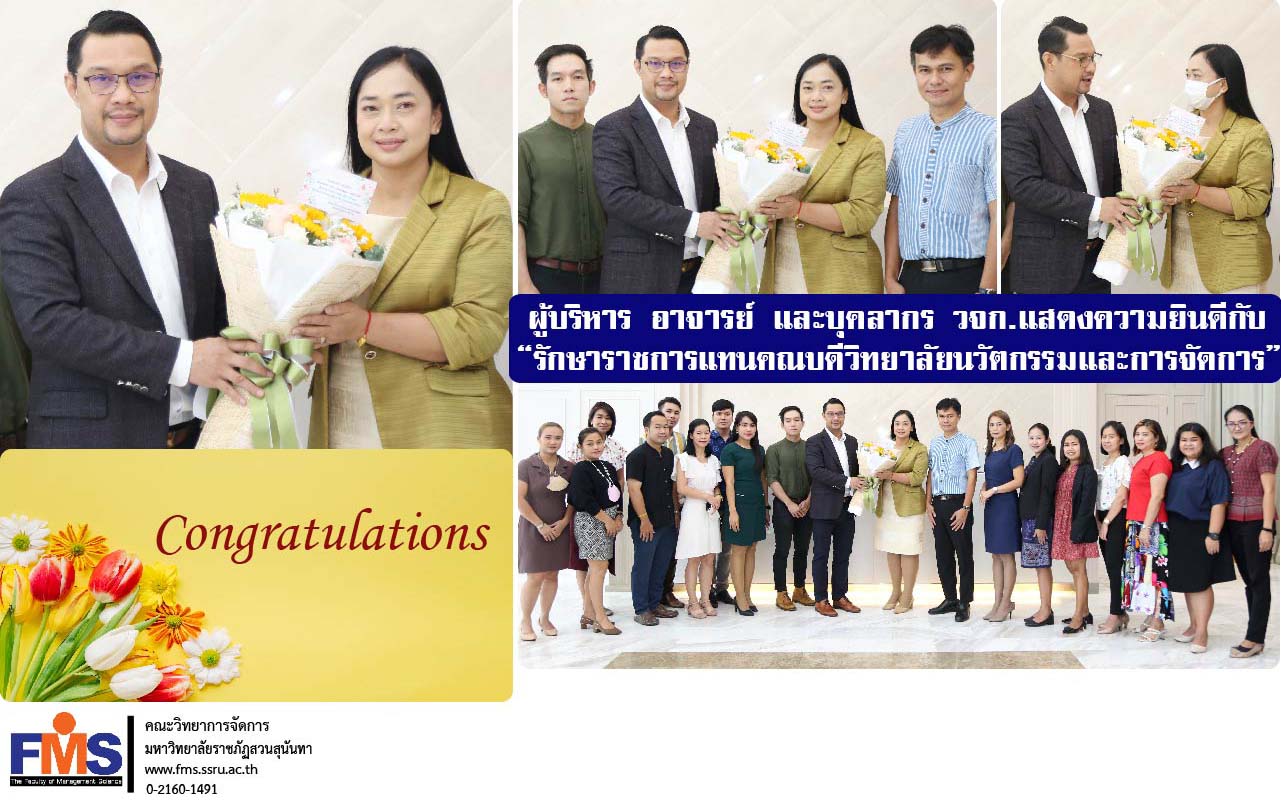 On September 30, 2022, Assistant Professor Dr. Somsak Klaysung, Dean of the Faculty of Management Science along with Associate Dean, Lecturer and Academic Support personnel of the Faculty Congratulations on giving bouquets of flowers To Assistant Professor Dr. Chonlapasorn Sitthiwarongchai On the occasion of being appointed to the position Acting Dean of College of Innovation and Management Suan Sunandha Rajabhat University at the Office of the President, Building 31 floors.