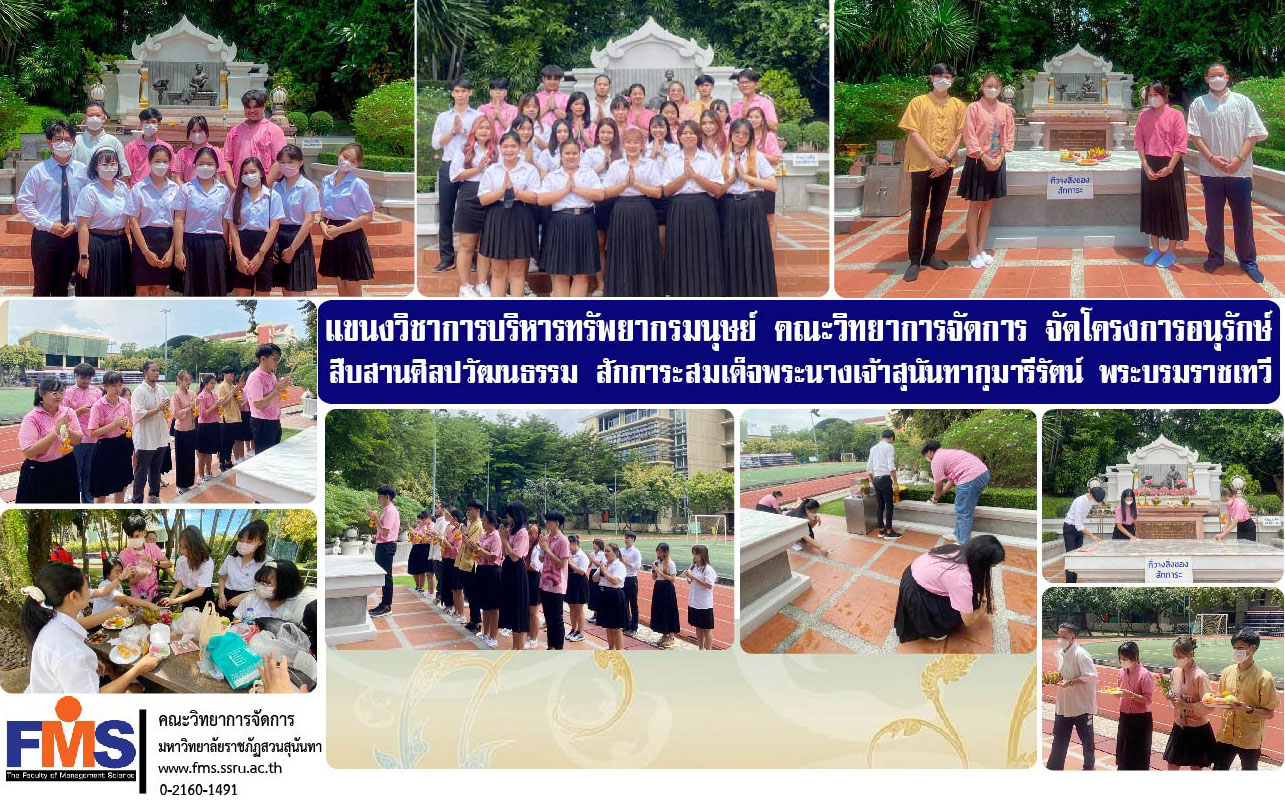 Human Resource Management Faculty of Management Sciences organize a project to conserve arts and culture in worship of Queen Sunandha Kumariratana royal palace to preserve and carry on Thai arts and culture Buddhism including team development fostering a sense of sustainable goodness among students By serving the common good Activities include Paying homage to Queen Sunandha Kumariratana royal palace Service for cleaning the area around the royal monument For this project, it is part of the technical team development course. with Ajarn Kanokwan Kaewprasert as the advisor to the project, held at the monument of Queen Sunandha Kumariratana. royal palace Suan Sunandha Rajabhat University.