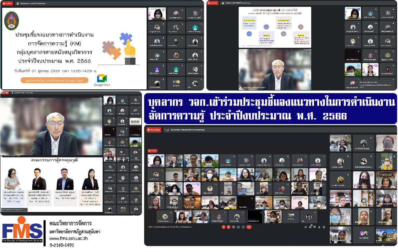 On October 31, 2022 at 1:00 p.m. Academic Support Personnel Faculty of Management Sciences Attended a meeting to clarify guidelines for knowledge management among academic support personnel Fiscal Year 2023 by Associate Professor Dr. Wittaya Mekkham, Vice President for Planning and Quality Assurance presided over the meeting in the form of an online meeting with the Google Meet program.
