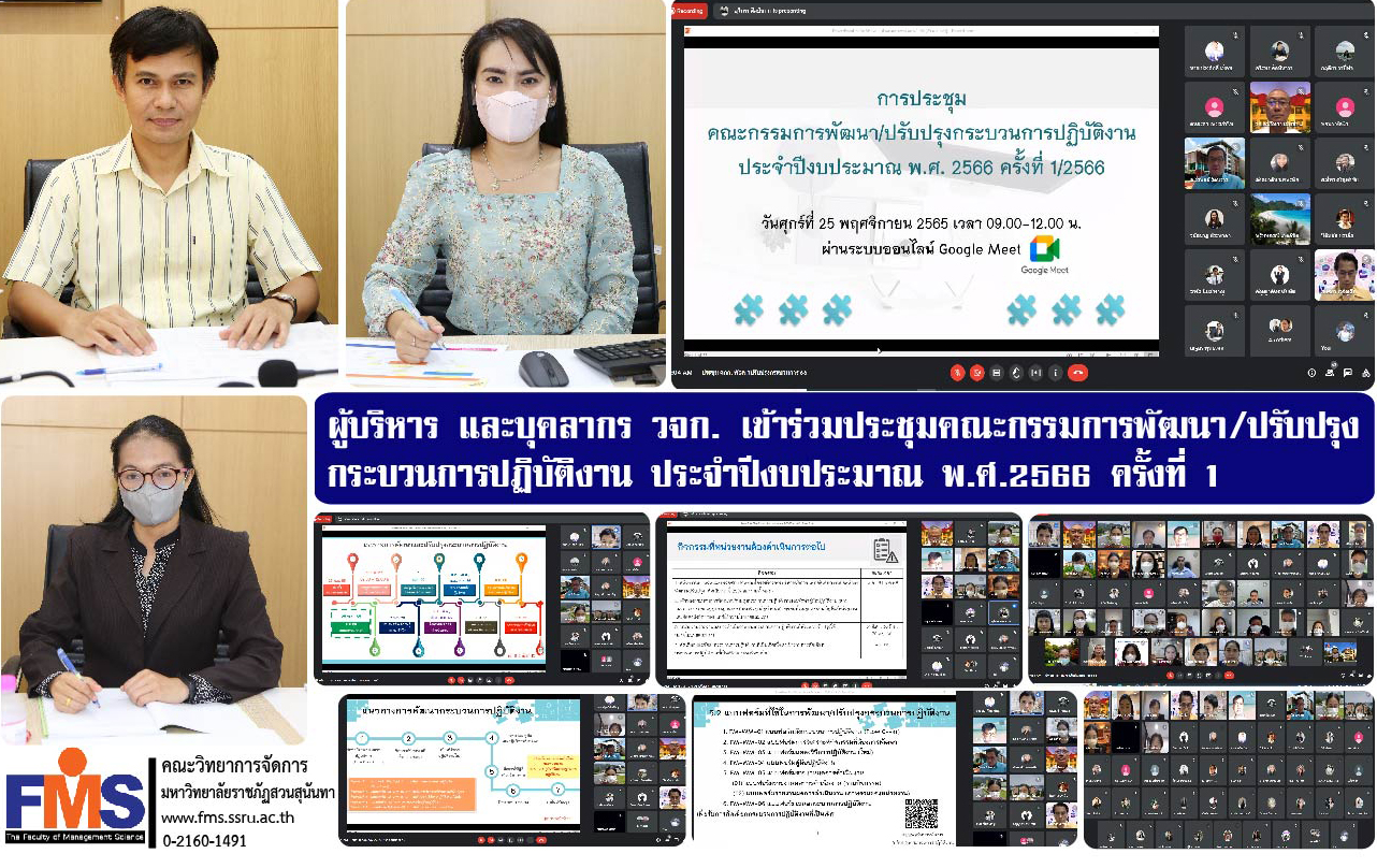 On November 25, 2022 at 9:30 a.m. Mr. Pitimanas Bunlue, Deputy Dean for Administration Faculty of Management Sciences along with Ms. Jinjutha Srihera, Head of the Dean's Office and Ms. Pakaporn Detanant, Acting Head of General Administration Department Participated in the development/improvement committee meeting Fiscal Year 2023 No. 1 by Associate Professor Dr. Wittaya Mekkham, Vice President for Planning and Quality Assurance presided over the meeting in the form of an online meeting with the Google Meet program.