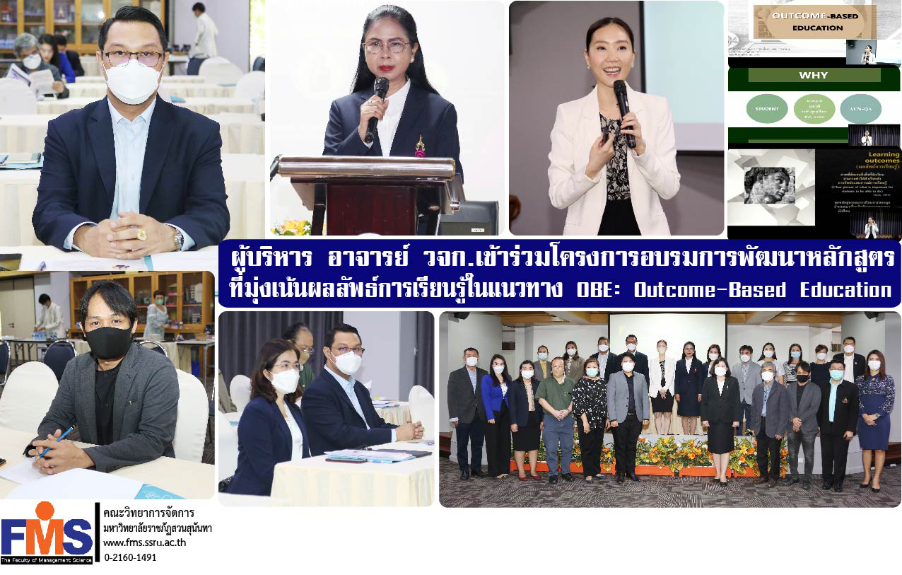 On November 30, 2022 at 8:30 a.m., Assistant Professor Dr. Somsak Klaysung, Dean of the Faculty of Management Sciences along with Dr. Krisna Chuerchainat, Associate Dean for Academic Affairs and faculty members Participate in the curriculum development training program that focuses on learning outcomes in the OBE: Outcome-Based Education approach organized by the Educational Service Division. with Associate Professor Dr. Nantiya Noichan, Vice President for Academic Affairs presided over the inauguration of the training program In this training was honored by Assistant Professor Dr. Supawan Sajjapibul from the Faculty of Education Srinakharinwirot University Lecturer about Outcome-Based Education with administrators of the Faculty, Dean, Associate Dean for Academic Affairs, lecturers and related personnel attended the training at Suwapak Niwet Conference Room (5724), Building 57, Faculty of Management Science. and online training via Facebook live.